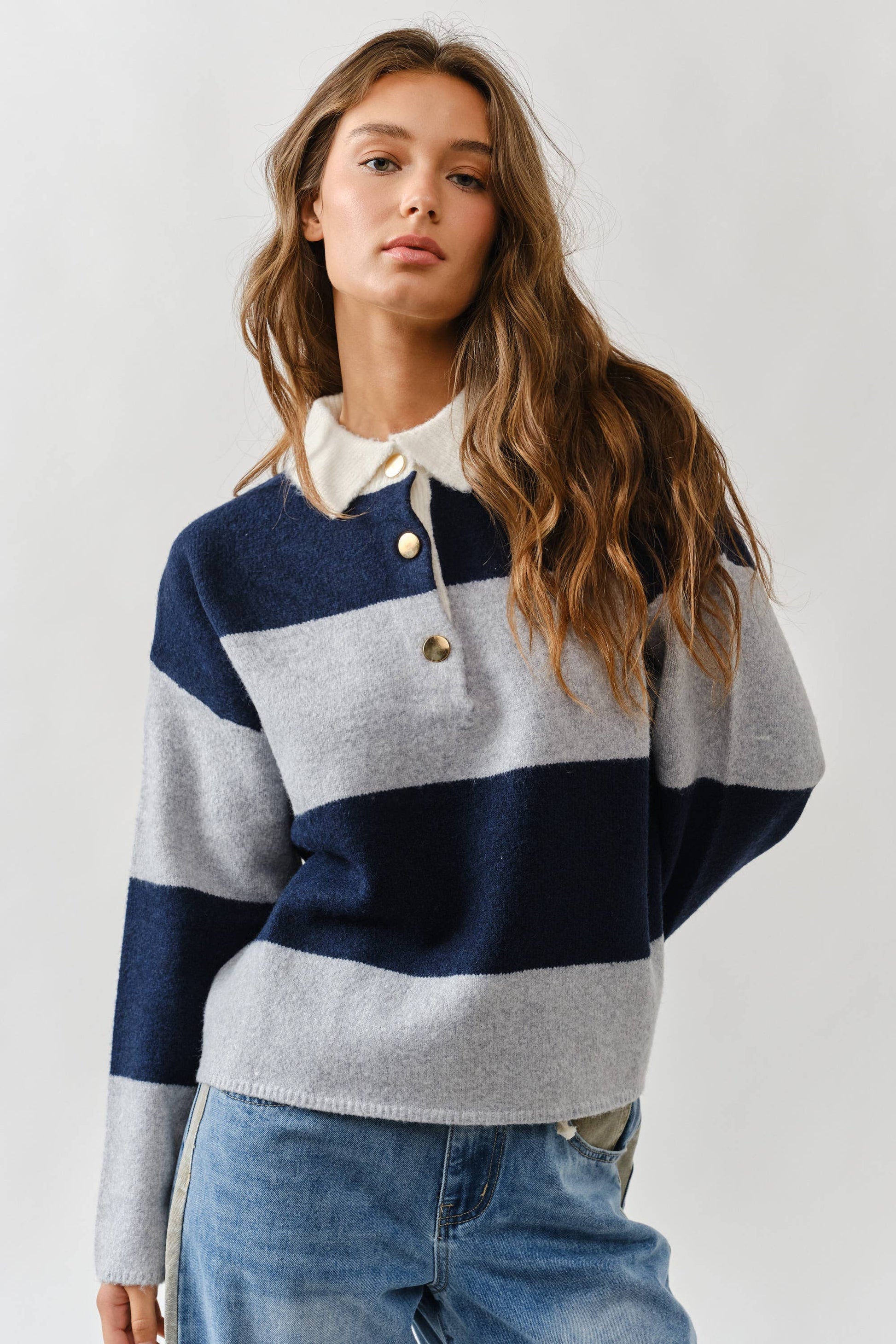 This Striped Polo Neck Sweater brings a playful preppy twist to your cool-weather wardrobe. Designed with bold horizontal stripes and a contrasting polo collar, it effortlessly combines classic and contemporary style. The relaxed fit and soft-touch knit ensure all-day comfort, while the button placket adds a refined finish.