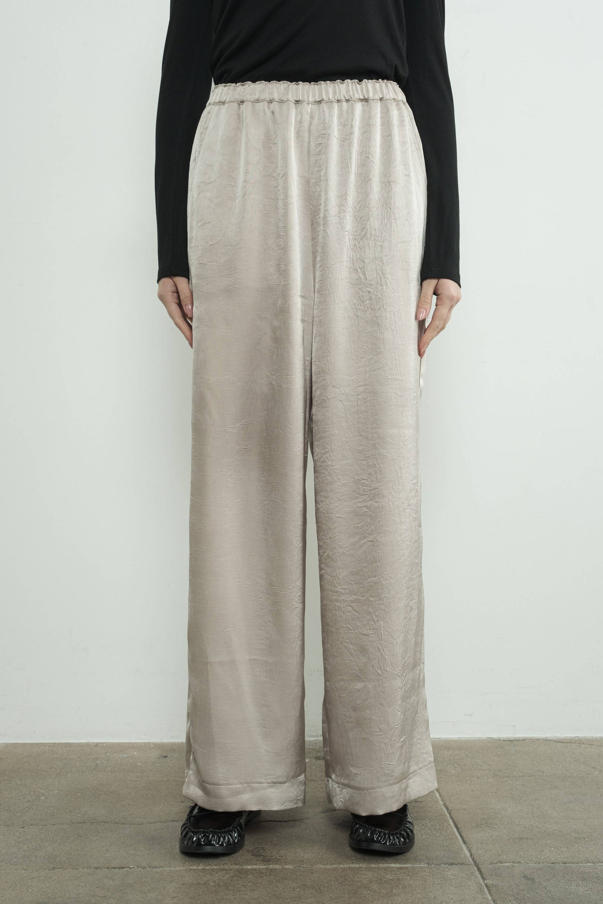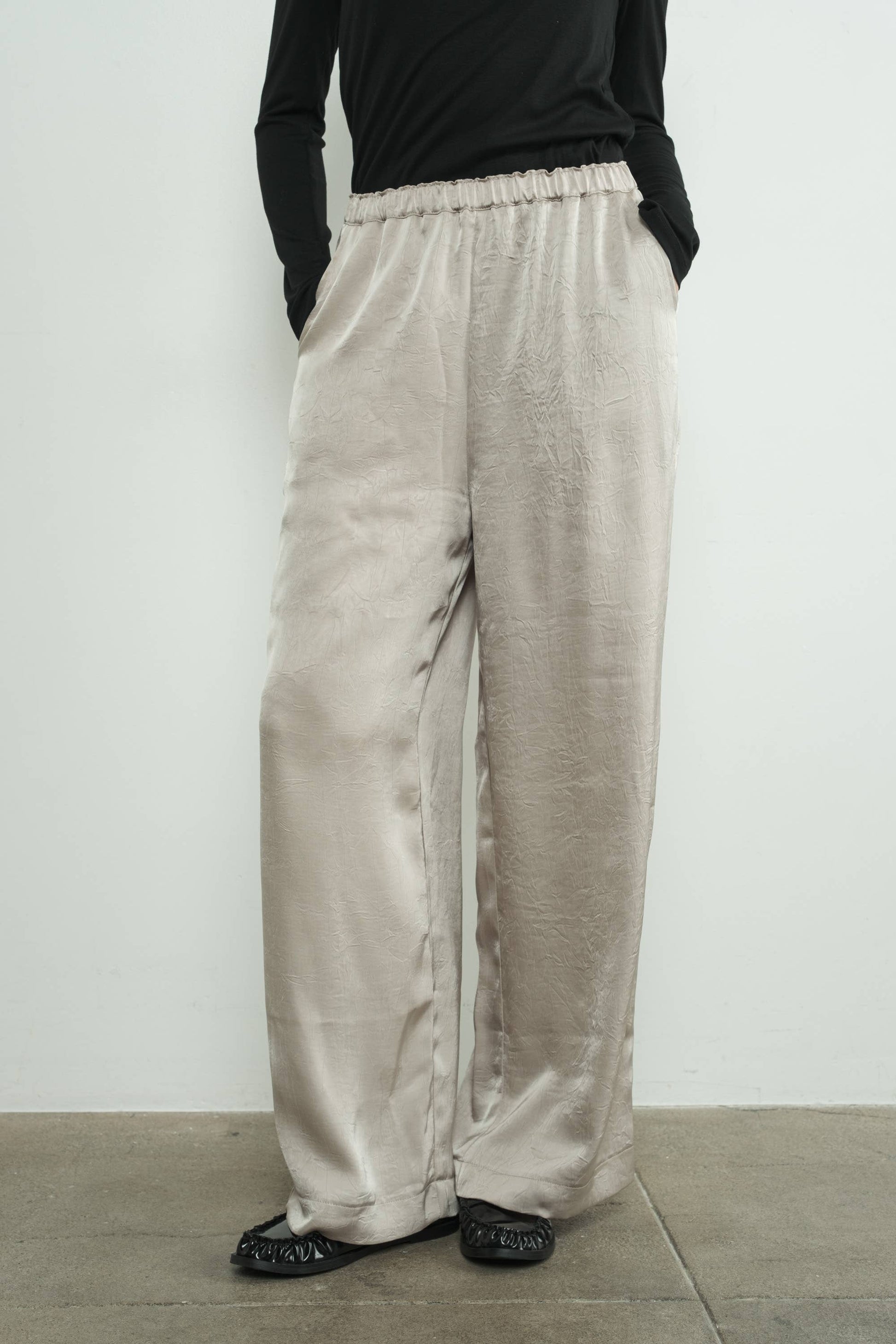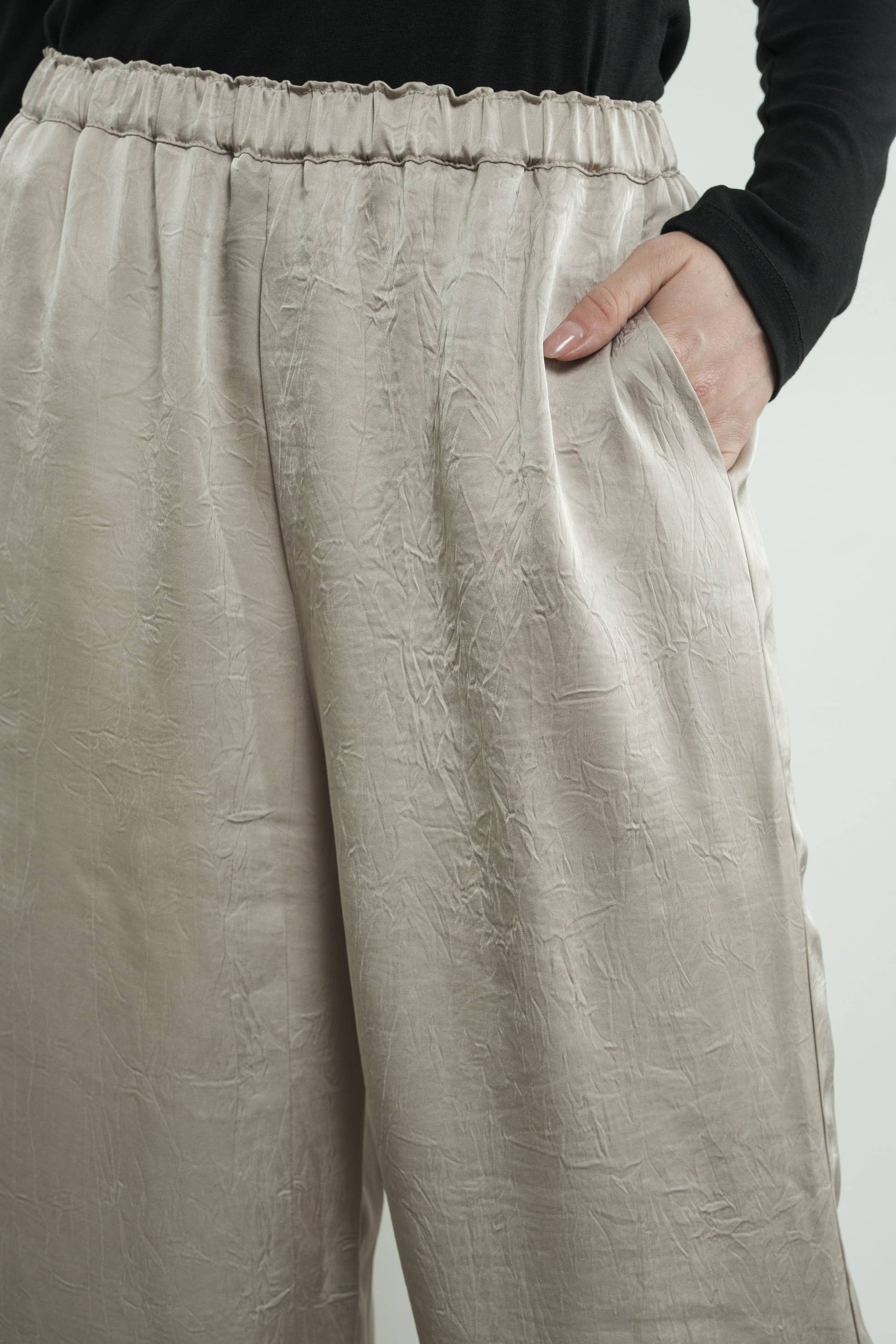 Crinkle satin pants with an elasticated waist and wide-leg fit, it is effortless sophistication that keeps you cool and cozy. The soft satin fabric adds a touch of feminine. -Side Pockets -Relaxed FIt