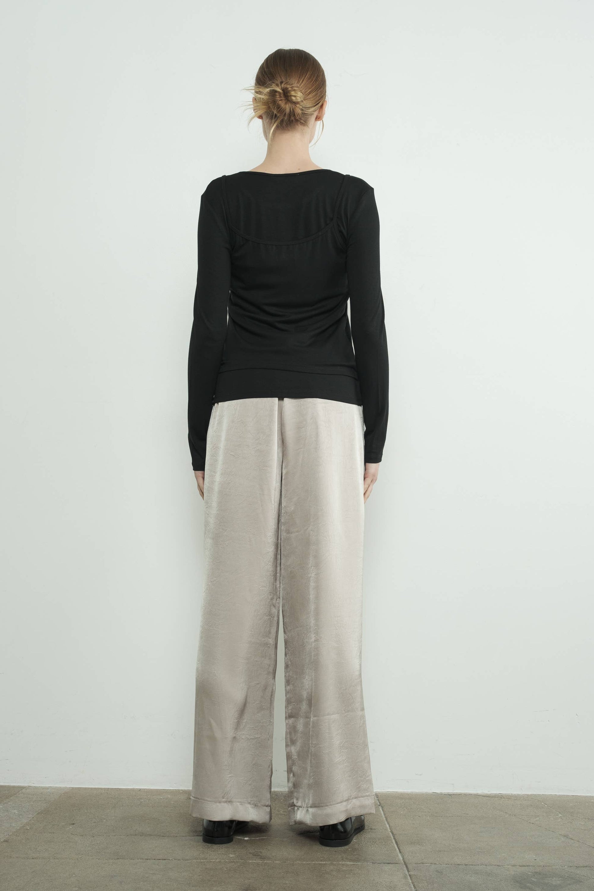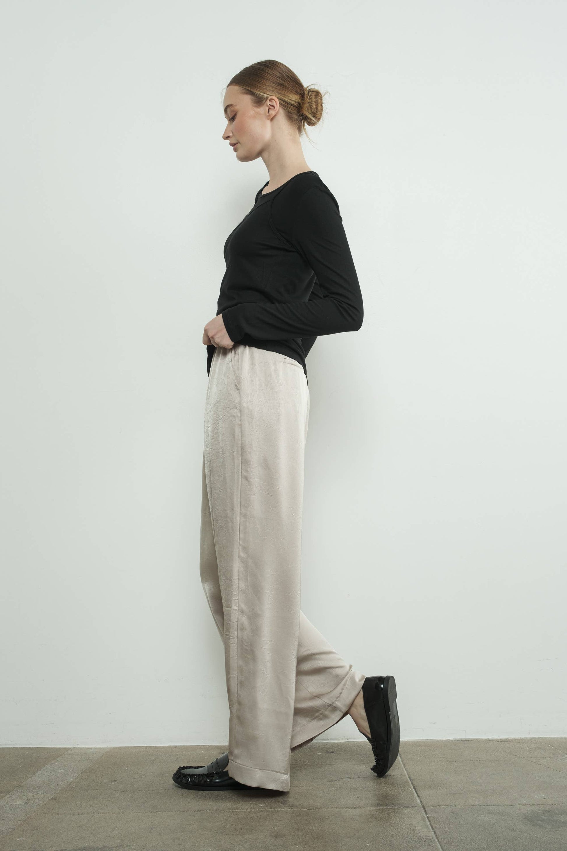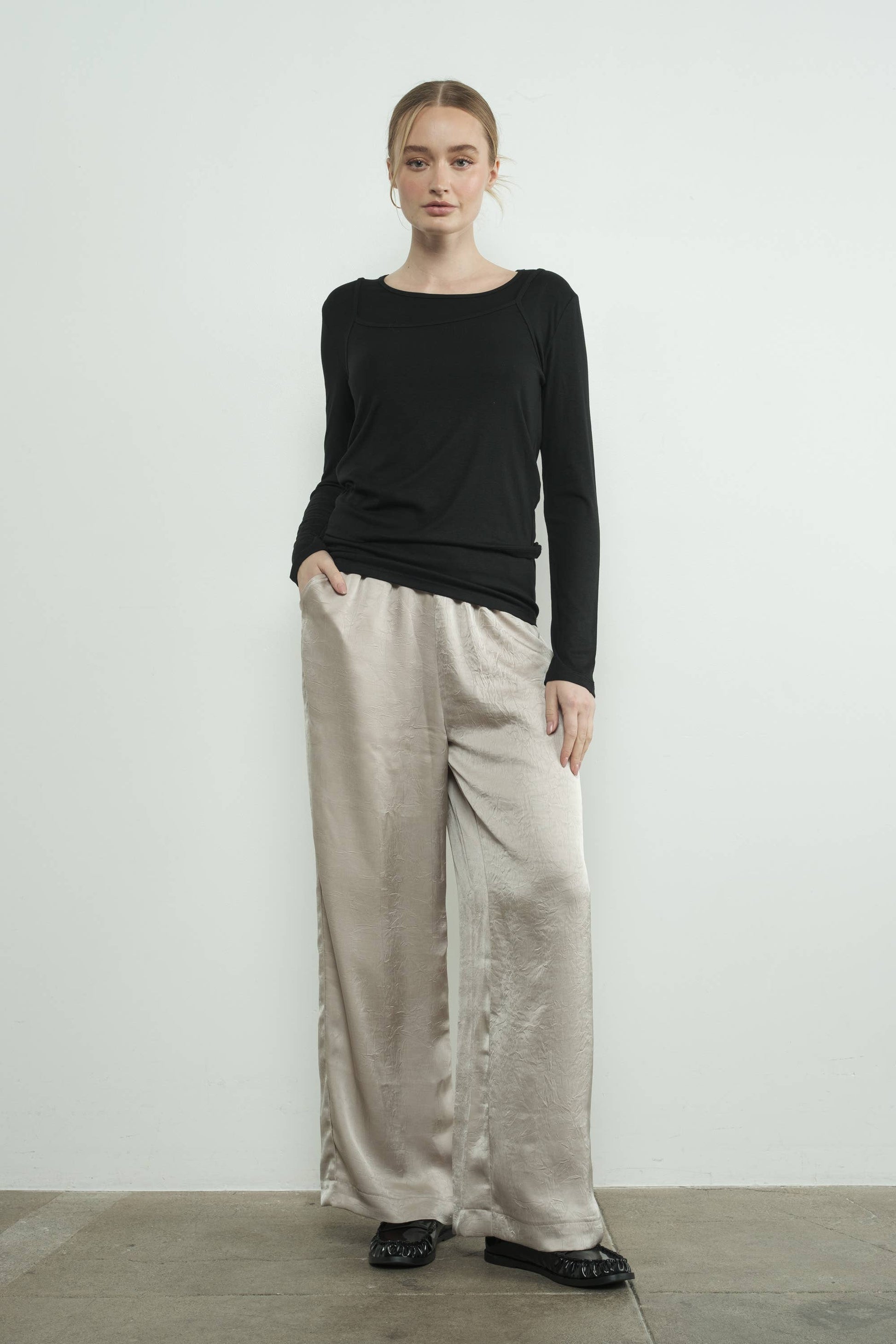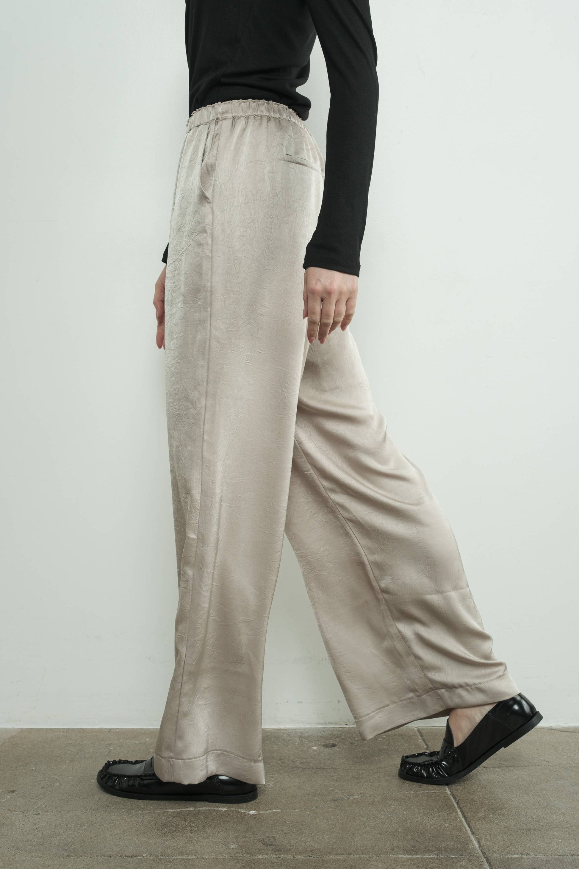Crinkle satin pants with an elasticated waist and wide-leg fit, it is effortless sophistication that keeps you cool and cozy. The soft satin fabric adds a touch of feminine. -Side Pockets -Relaxed FIt