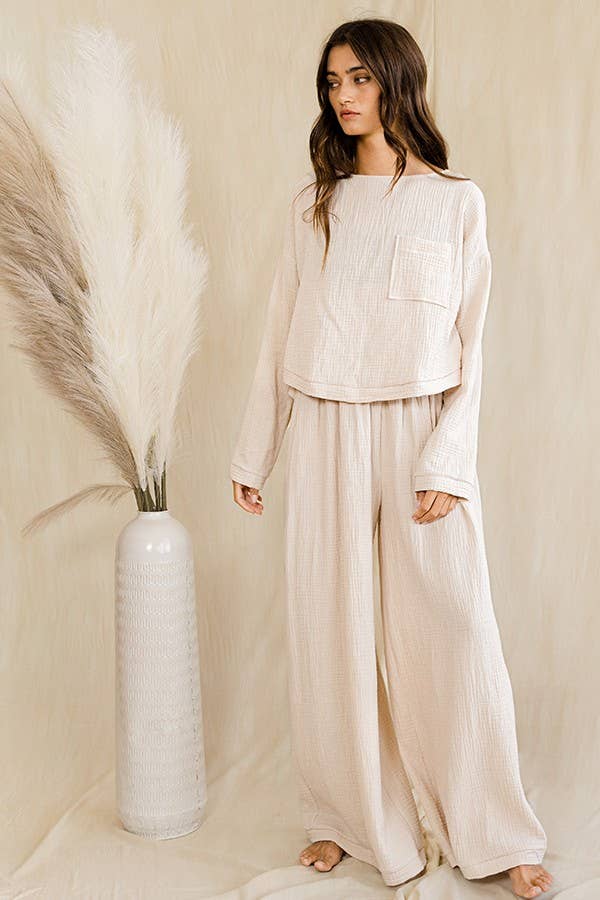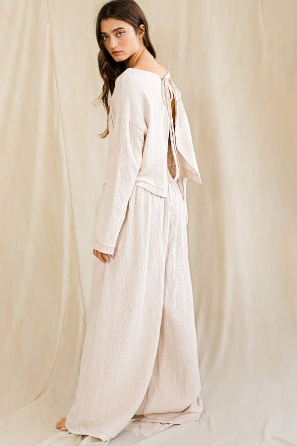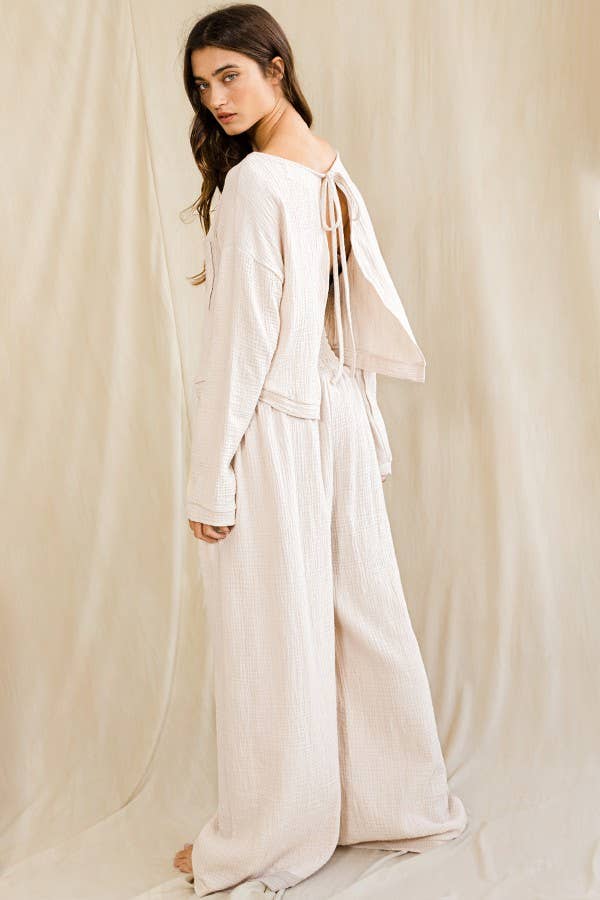 Cotton Gauze Self Tie Open Back Top - Solid lightweight crinkled cotton gauze fabric - Adjustable tie closure at the open-back - Long sleeve with banded cuffs - Crew neckline - Chest pocket - Rounded hemline - Cropped above the waist