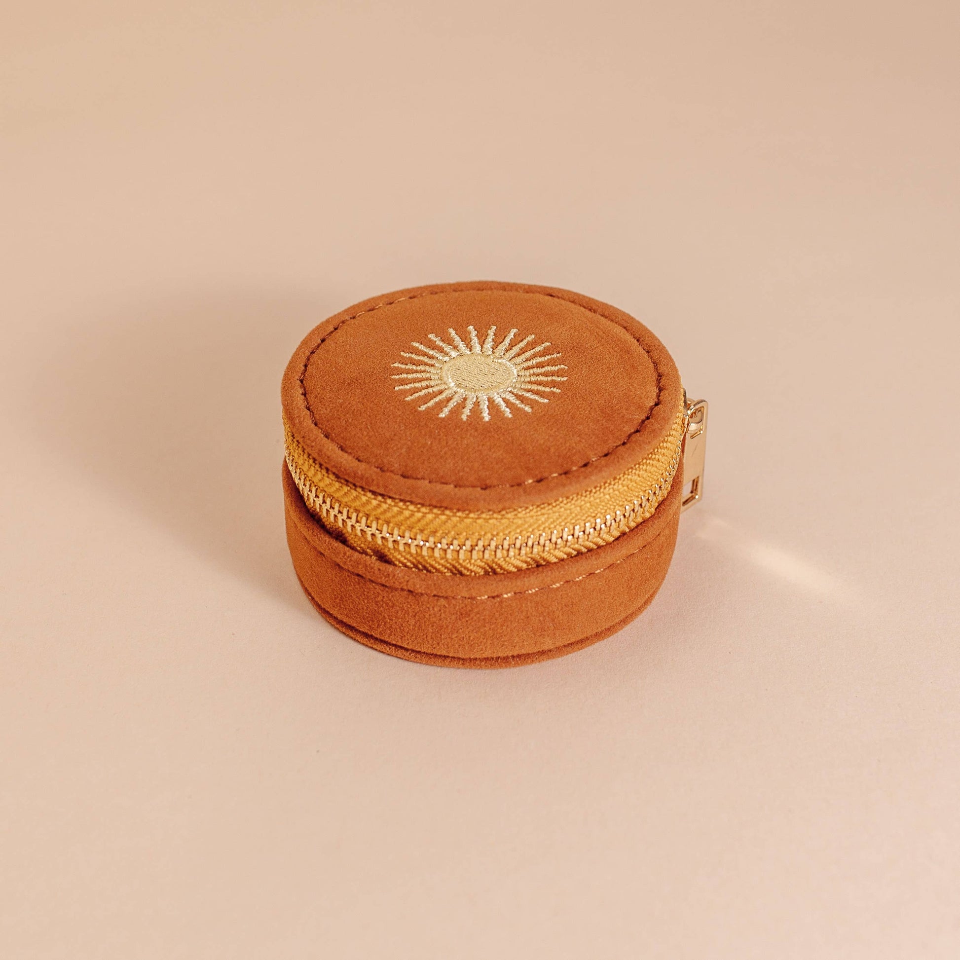 Keep your jewelry safe with our mini travel jewelry cases! Embroidered with a radiant sun, these make for the perfect way to take your jewelry on a weekend trip without it getting tangled or lost in your bag! • Measures 7 x 3.5cm • Includes internal pouch • Imported