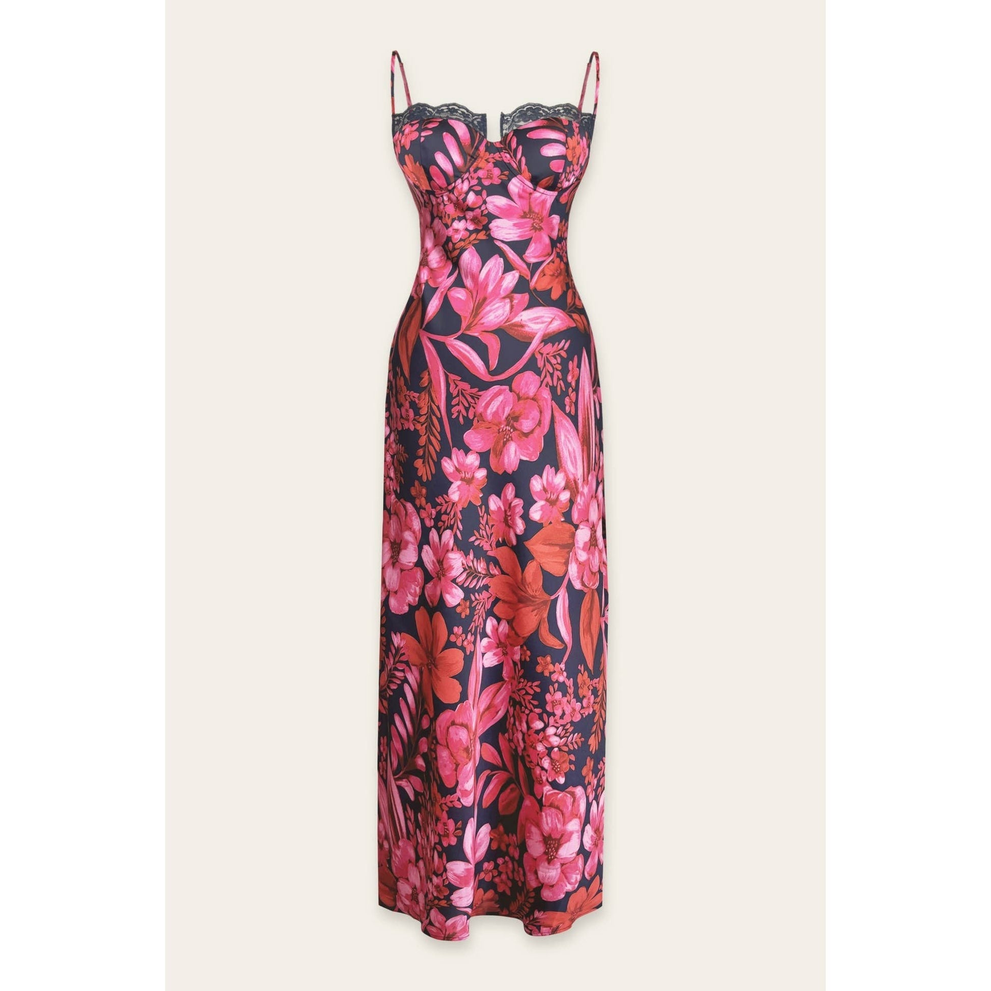 Floral print satin flare midi dress.