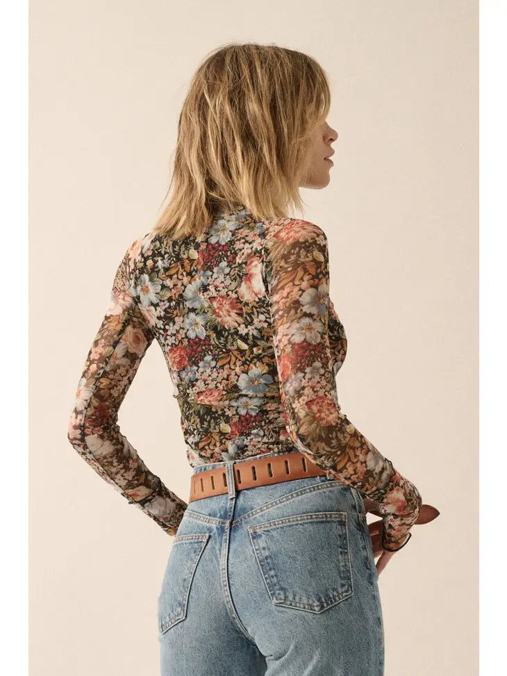 A floral print, knit top with the following features: Semi-sheer mesh fabric. High neckline. Exposed seams. Long sleeves with ruffle cuffs and thumb holes. Fitted silhouette.