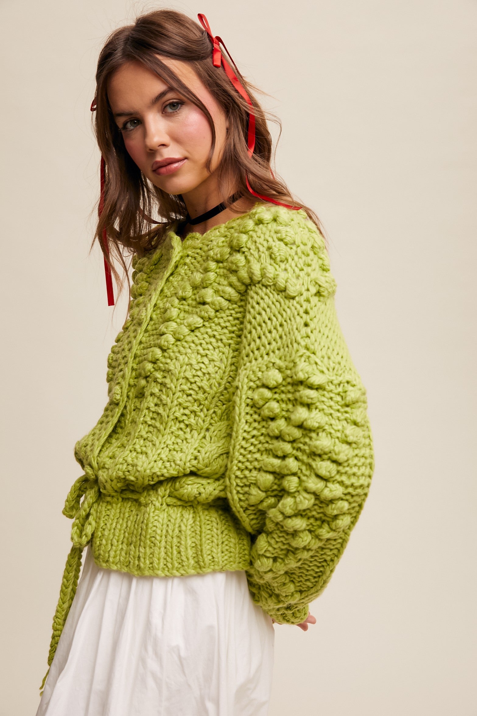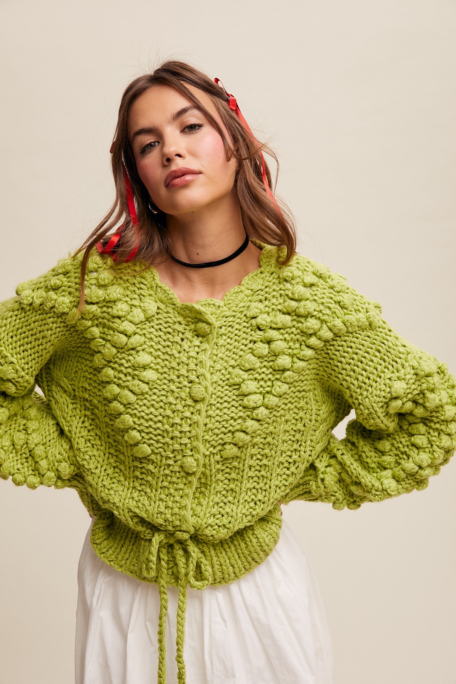 - Hand crochet tufted dot cable knit cardigan - Round neck with button down - Adjustable braided tie strinf on waist - Long sleeve - Pom pom dot detailing on body - Ribbed on neck, cuff and hem - Model is 5' 7.5" 33-24-34 and wearing a size Small