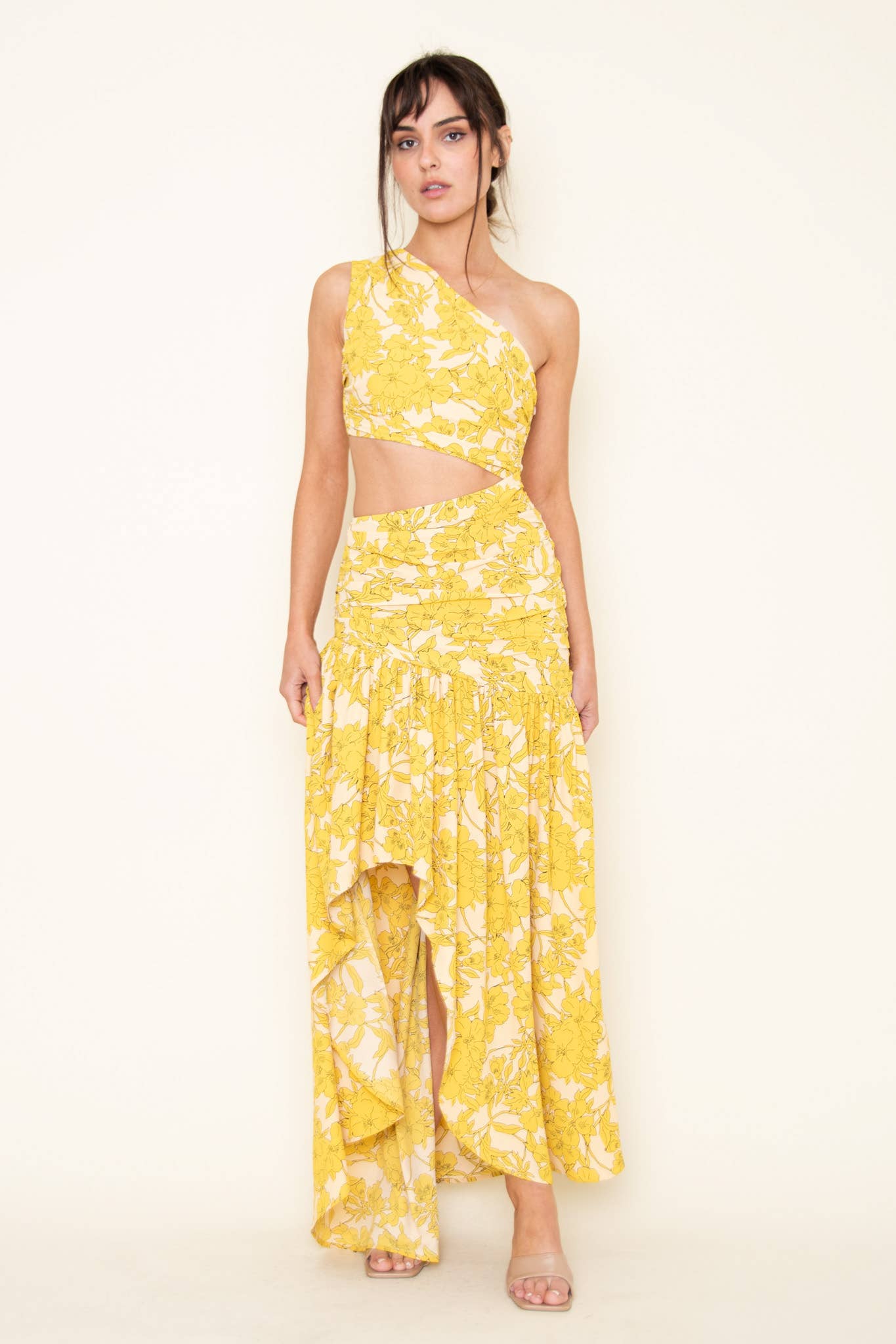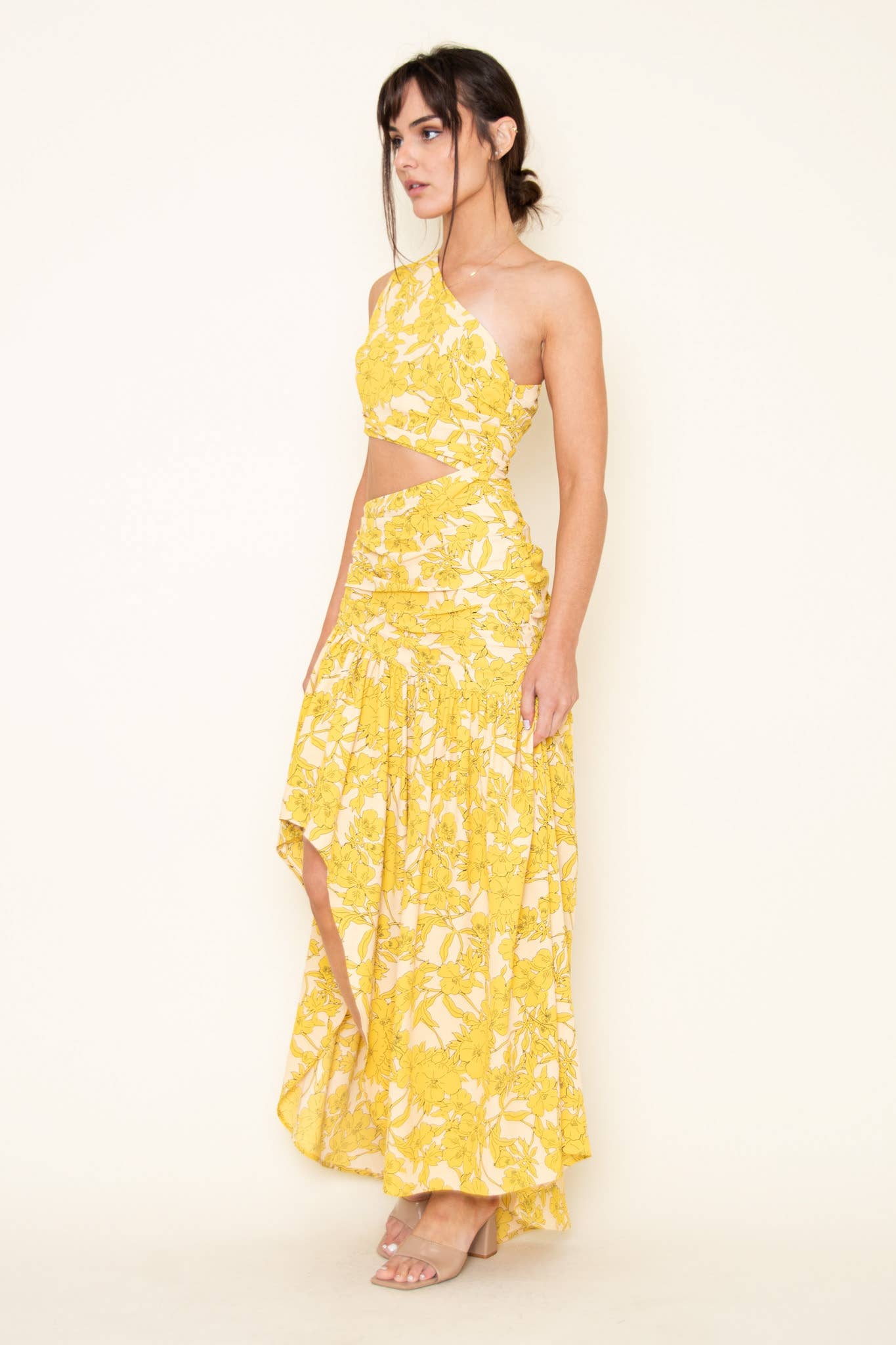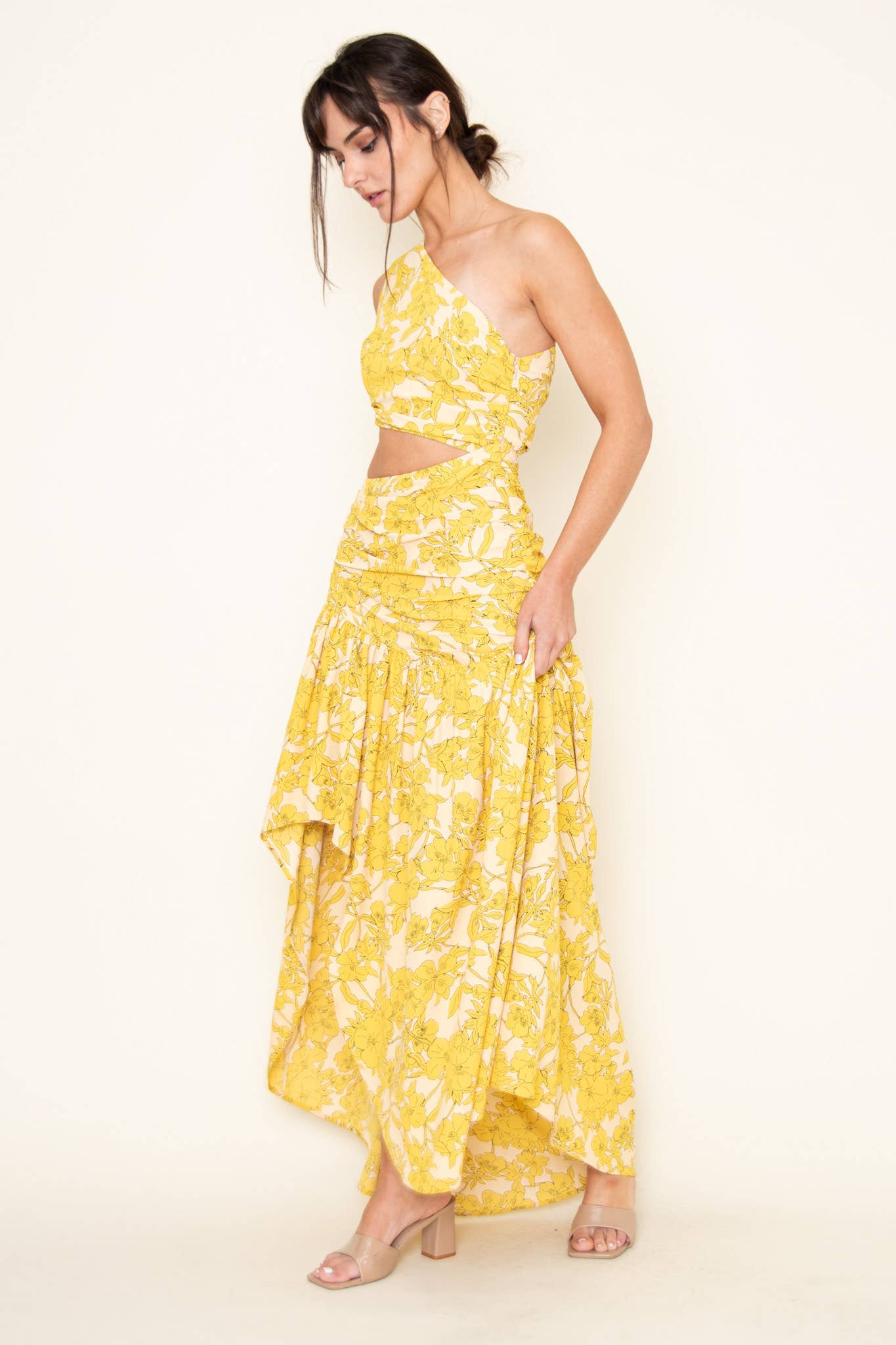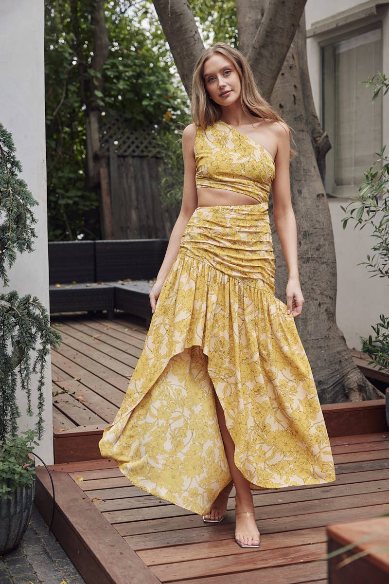one shoulder - midriff cutout - asymmetric draped skirt - maxi length - zipper closure