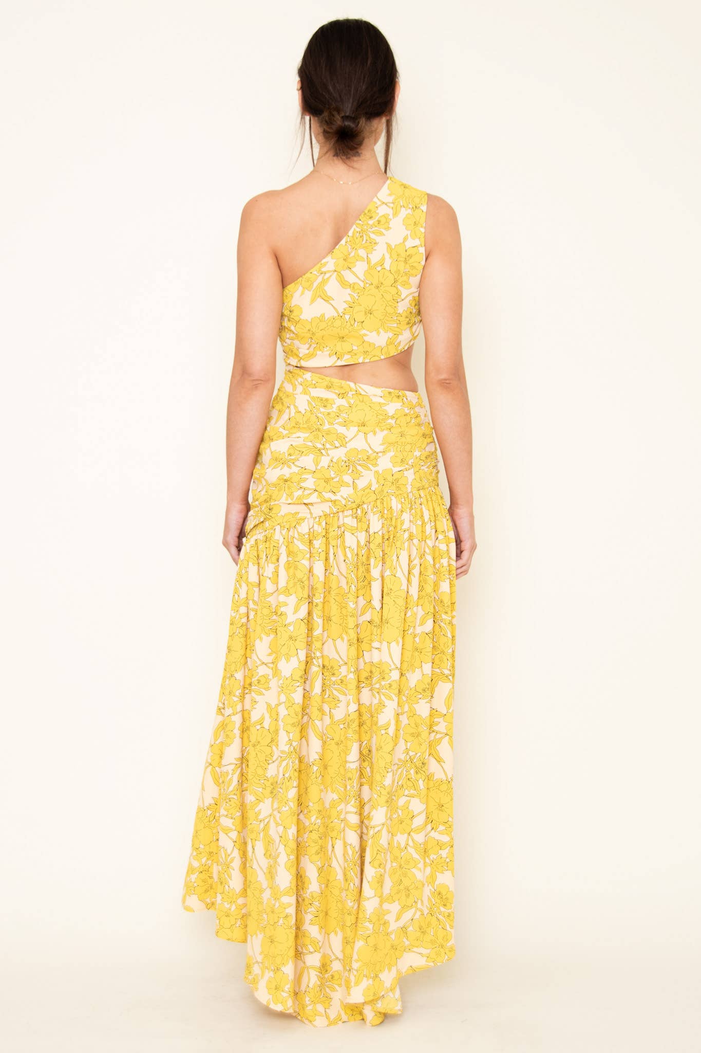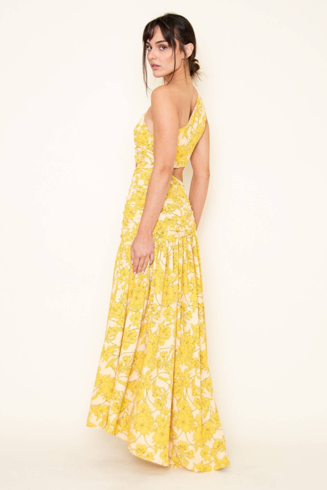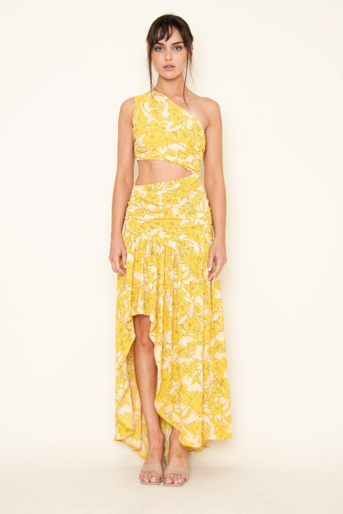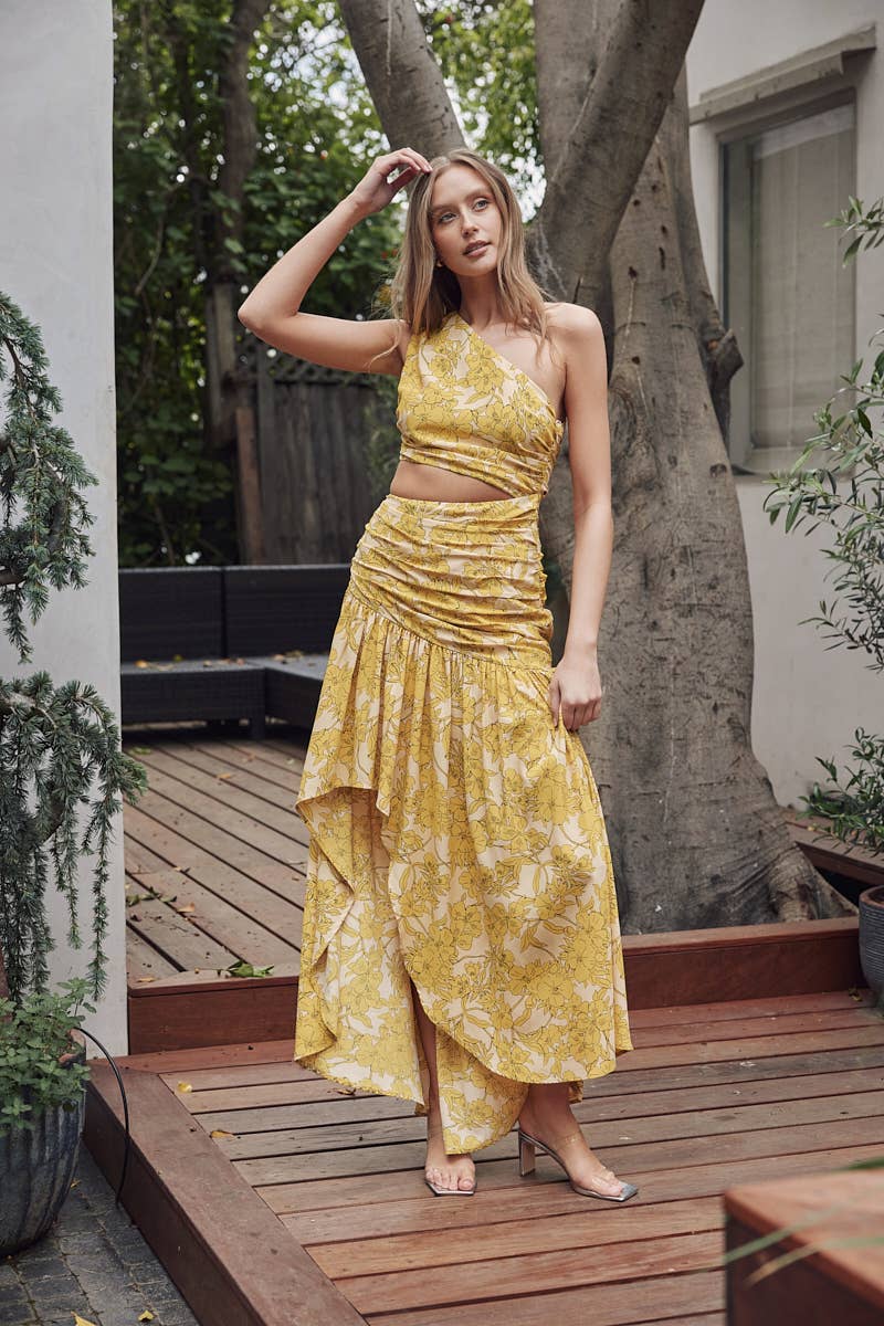 one shoulder - midriff cutout - asymmetric draped skirt - maxi length - zipper closure