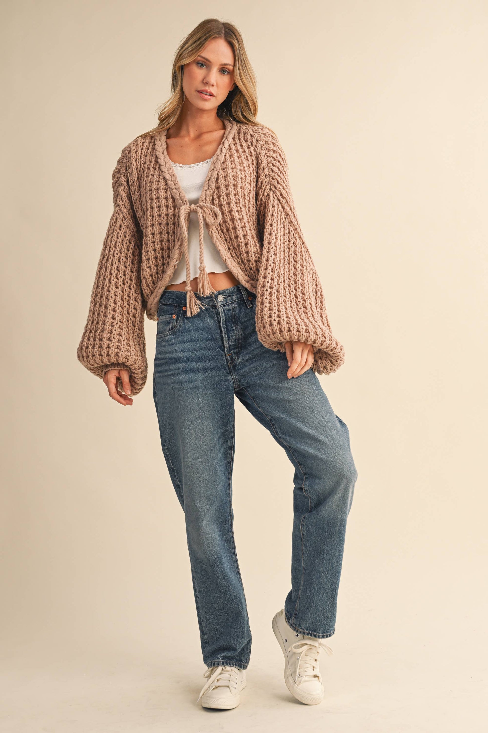 Balloon sleeve braided knit cardigan