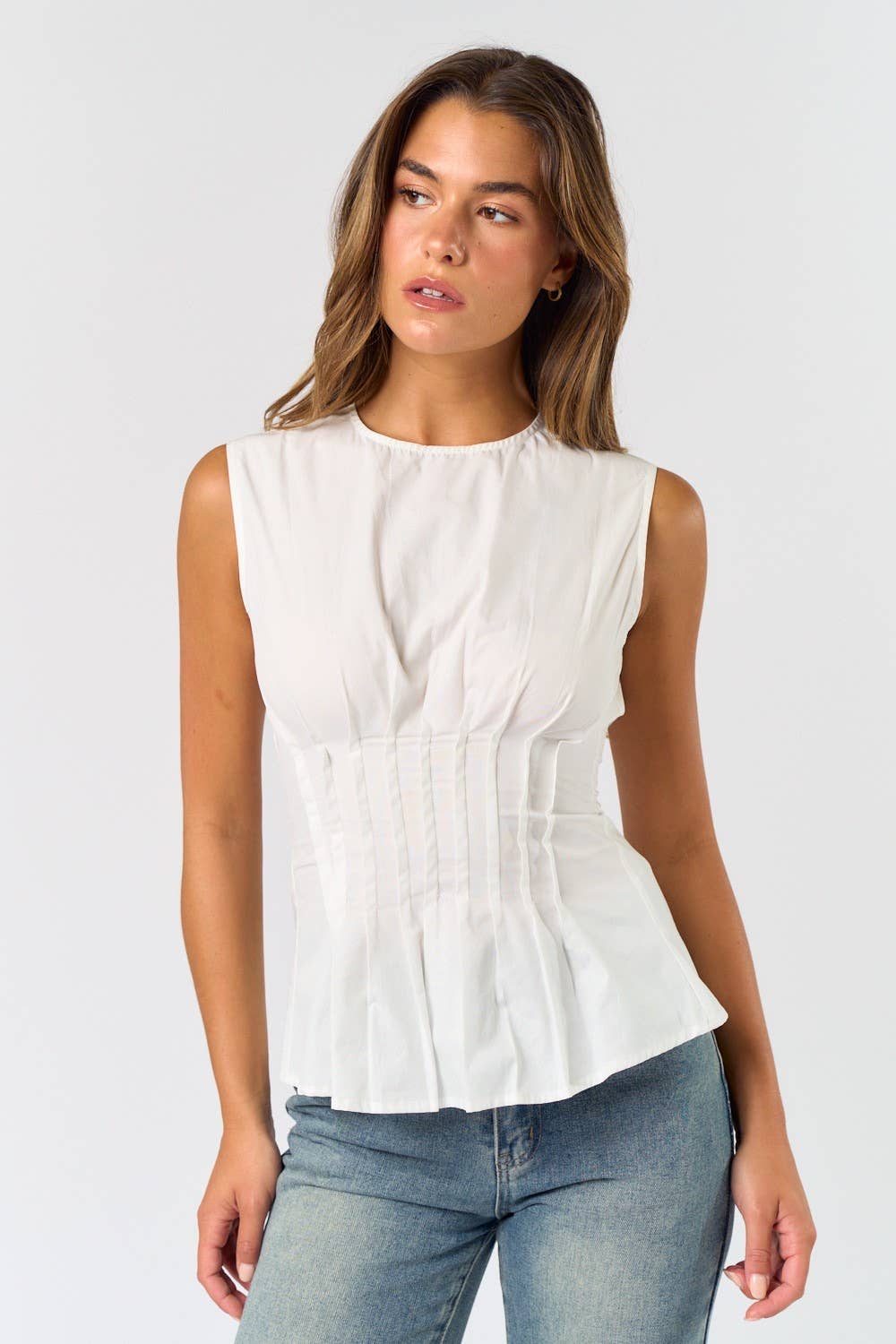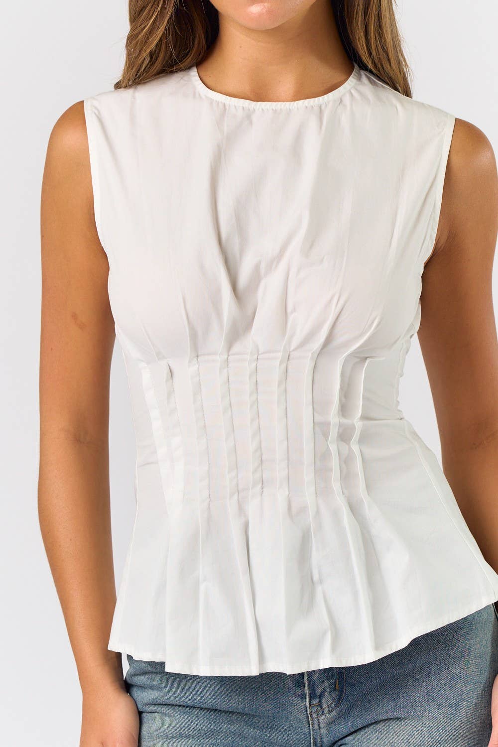 Sleeveless pleated poplin top - high neck - cinched waist - pleat detailing - zip neck closure - 100% cotton