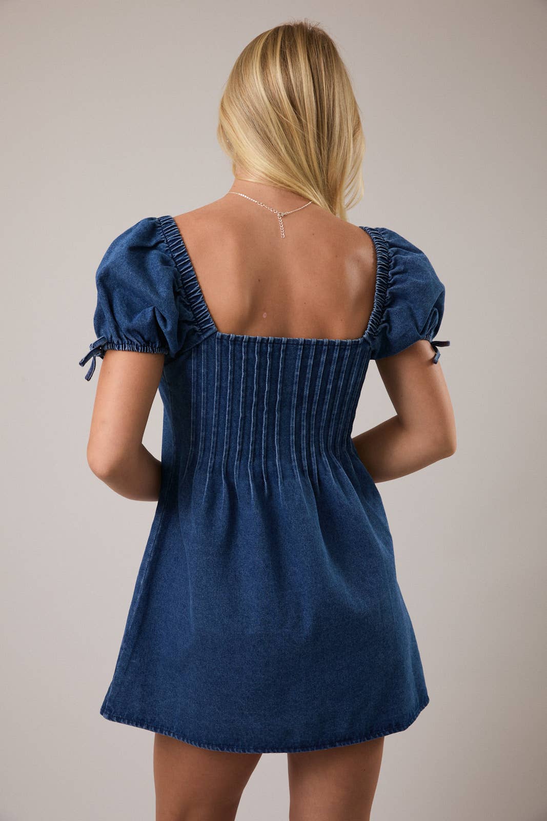 Denim mini dress with pintuck detail and puff sleeves
