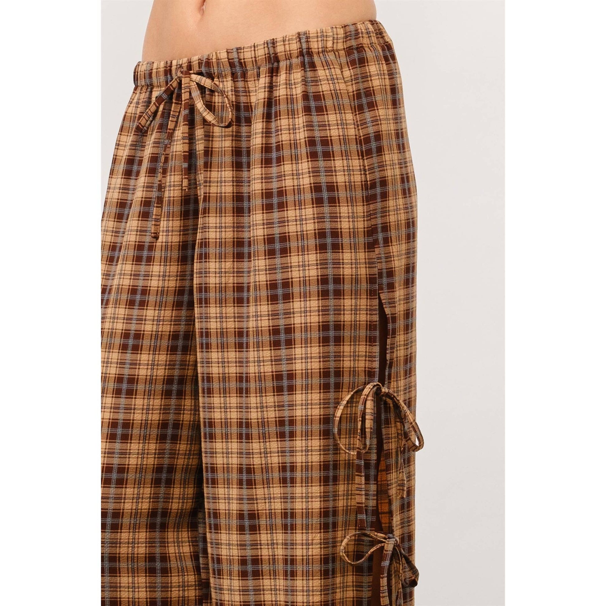 Textured plaid long lounge pants featuring an adjustable elastic waist band and open side seams with spaghetti ties.