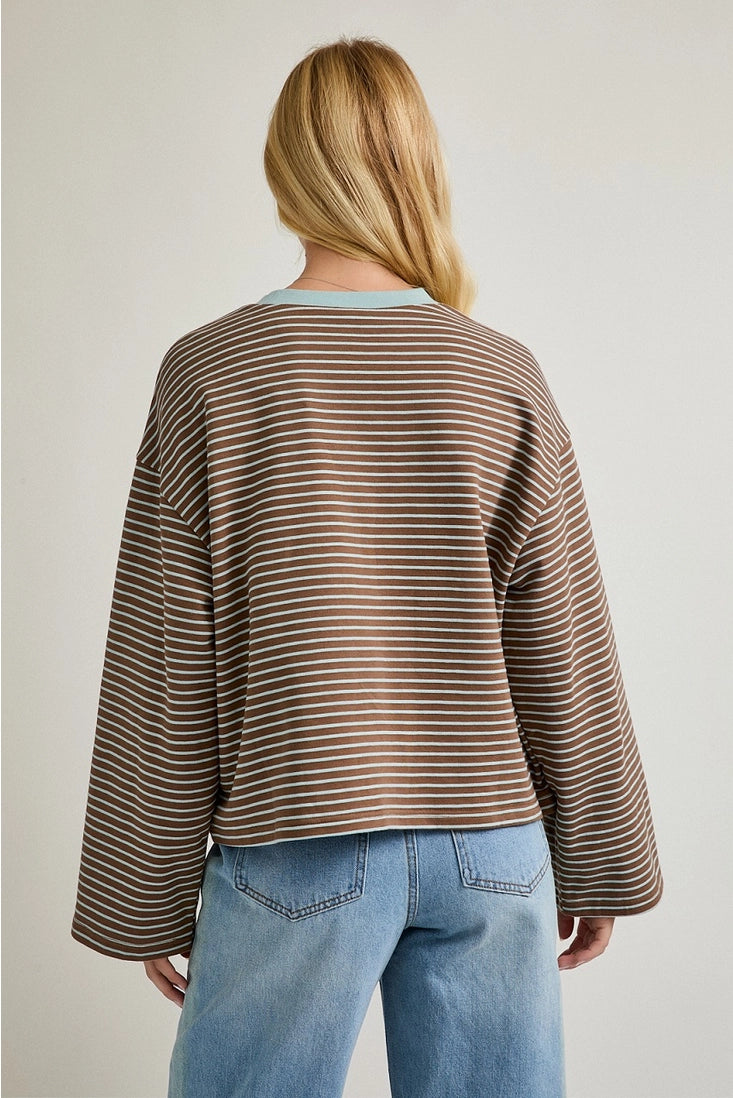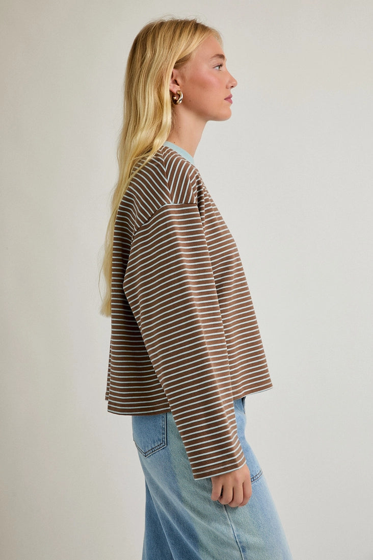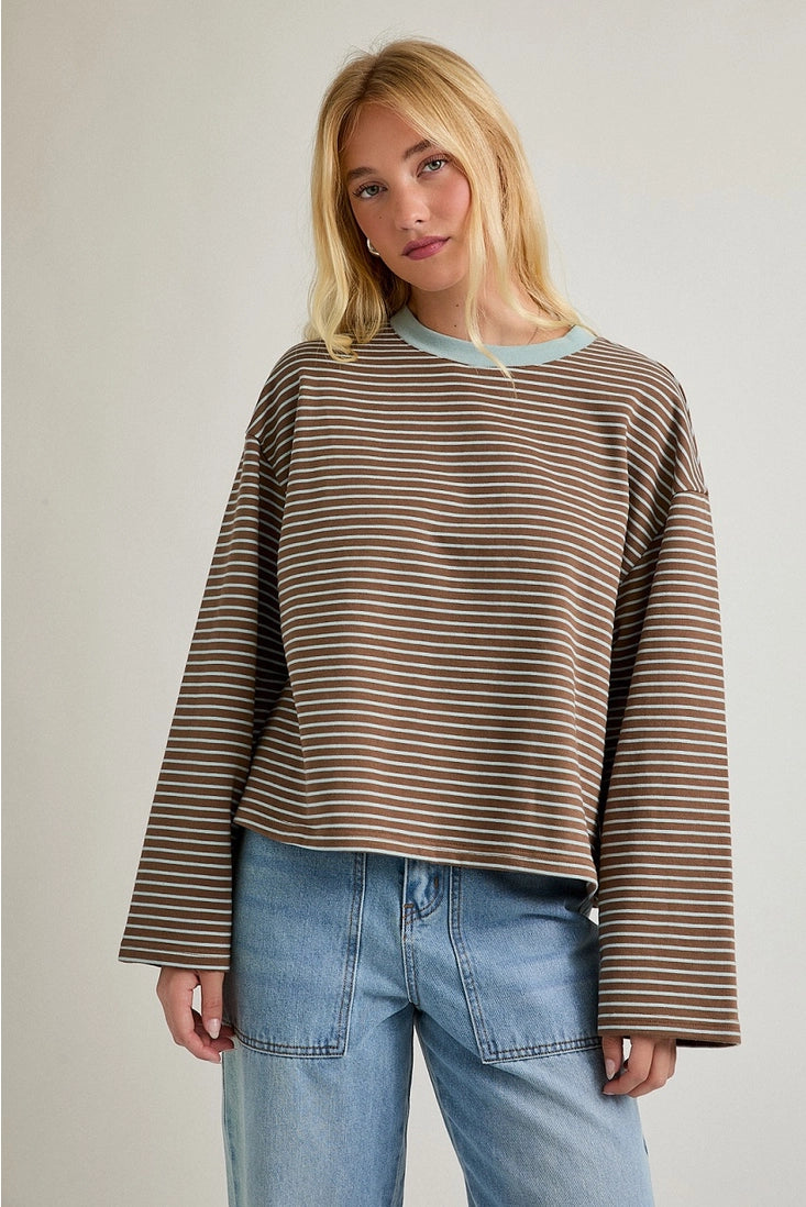Long sleeve crew neck striped boxy tee