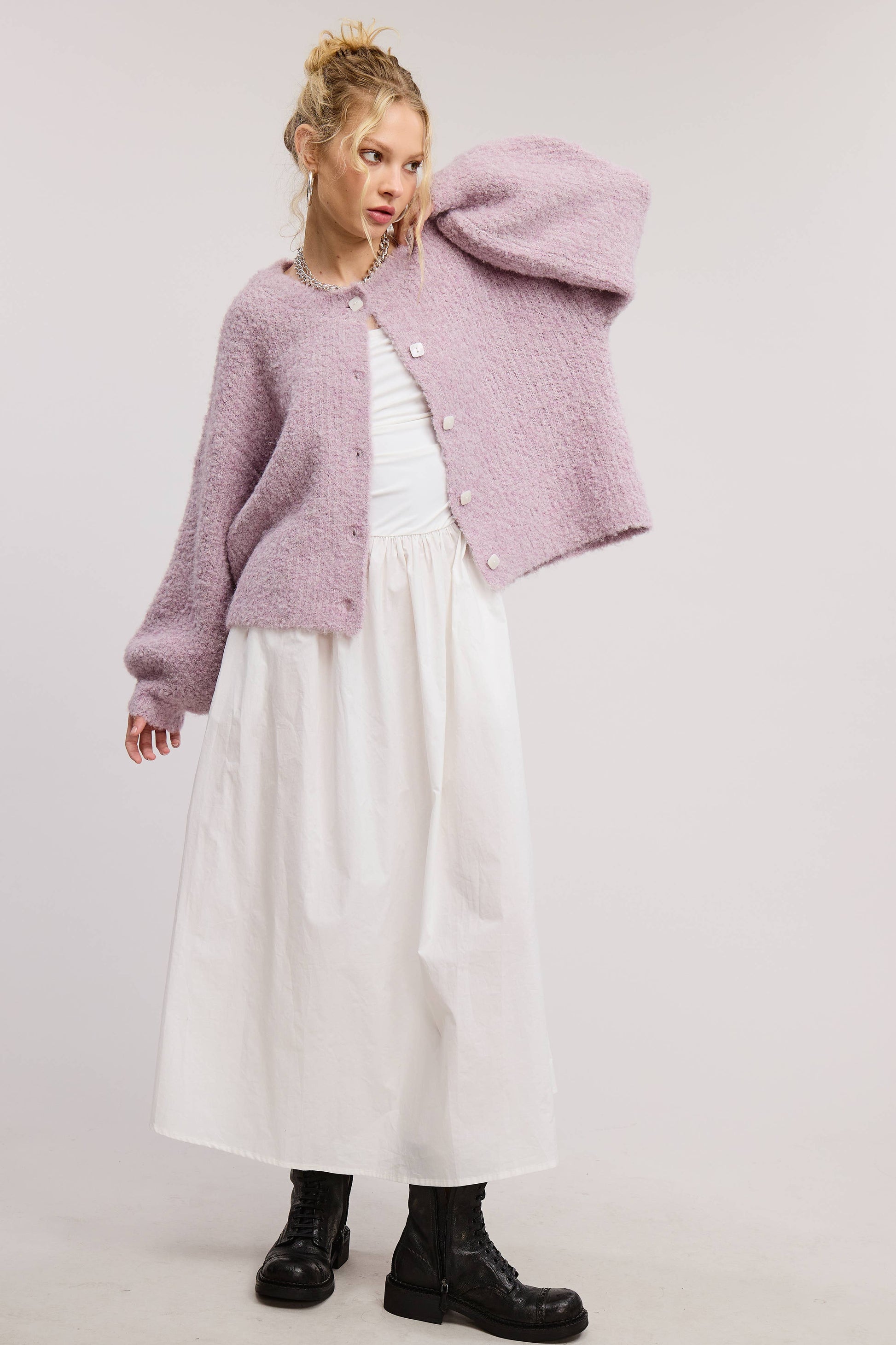Crafted from a multicolored confetti-knit fabric, this slightly oversized cardigan features a ribbed round neckline and sleeve cuffs, a square button-up front, long slouchy balloon sleeves, and a regular-length fit.