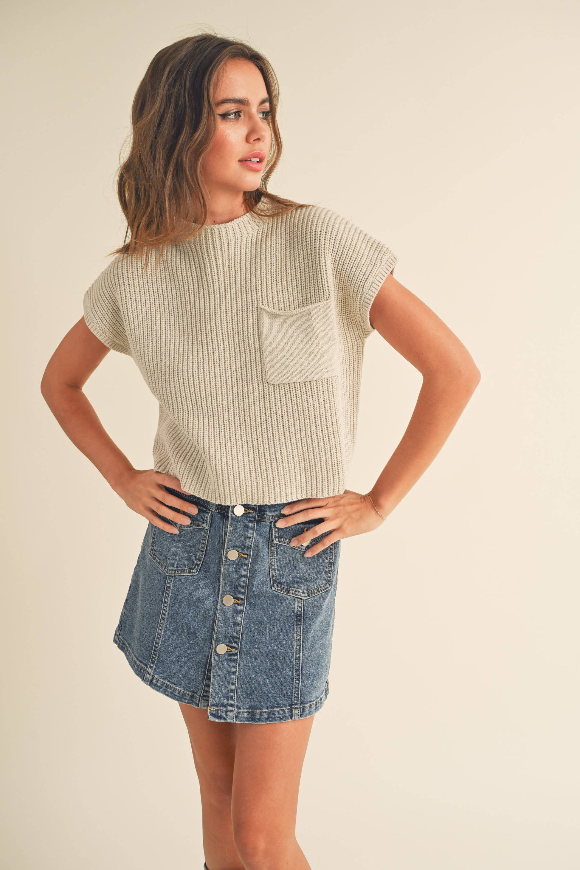 Mock neck short sleeve sweater with front pocket
