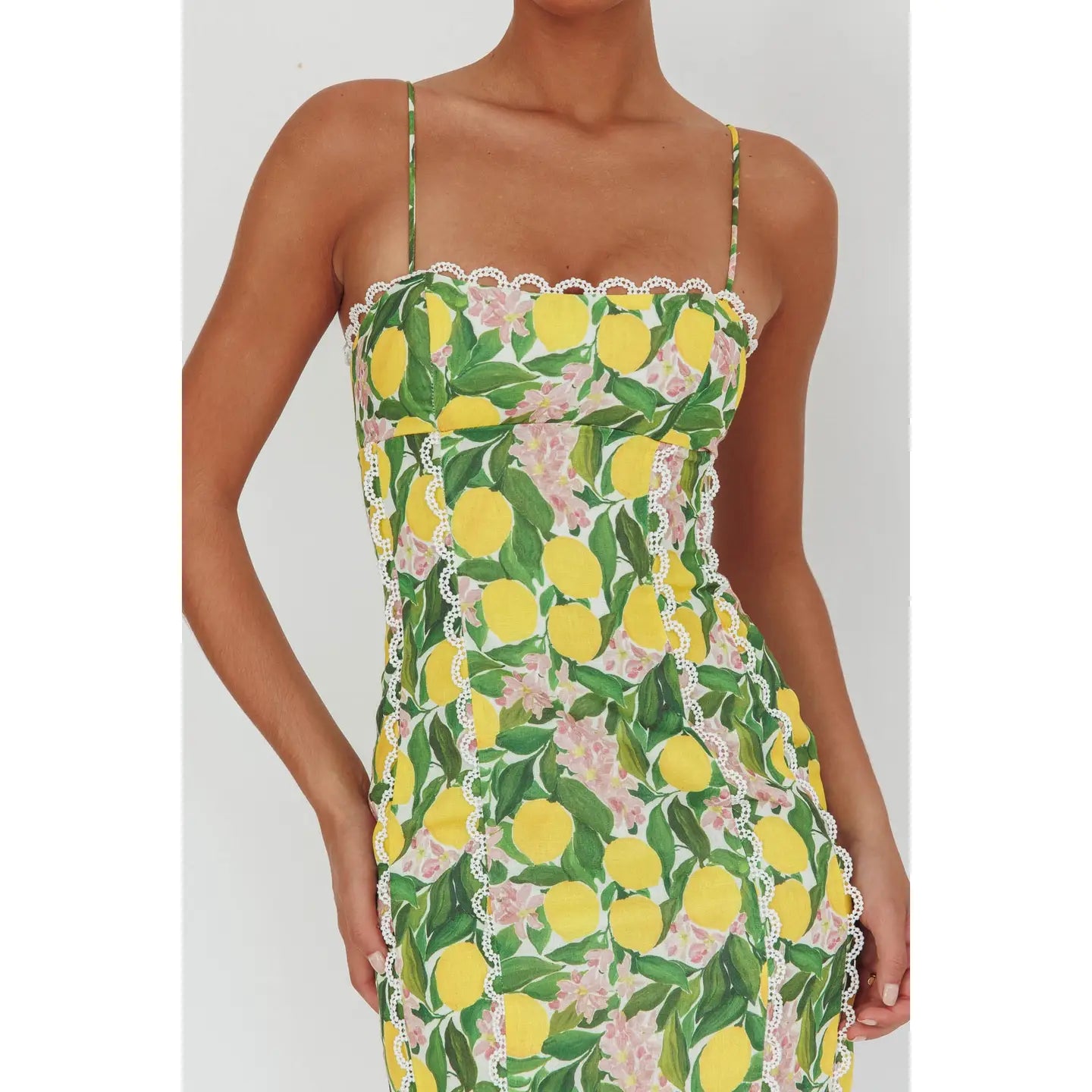 Sleeveless dress with spaghetti straps with vibrant lemons and flower. Fitted bodice design with scalloped lace trim