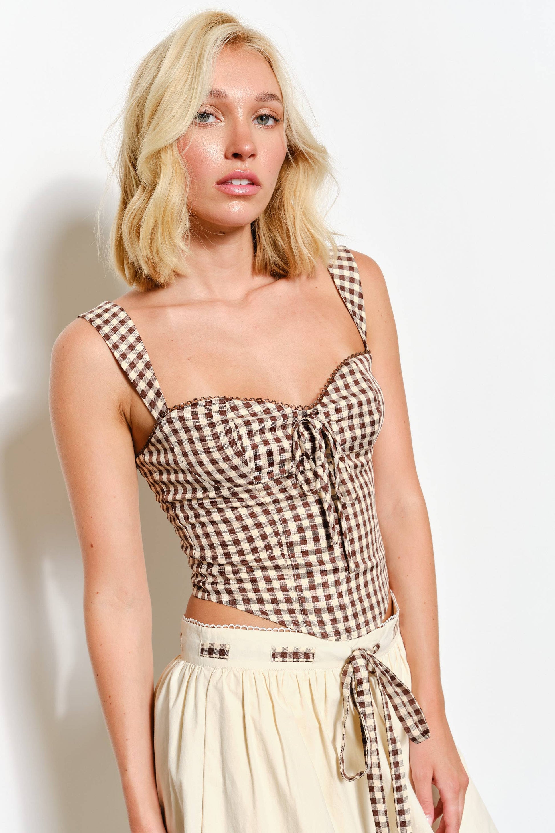 Gingham fabric for a timeless look - Adjustable spaghetti straps for a perfect fit - Scallop trim for delicate detail - Self tie at front for a touch of whimsy - Zipper at back for easy wear - Fully lined for comfort and structure