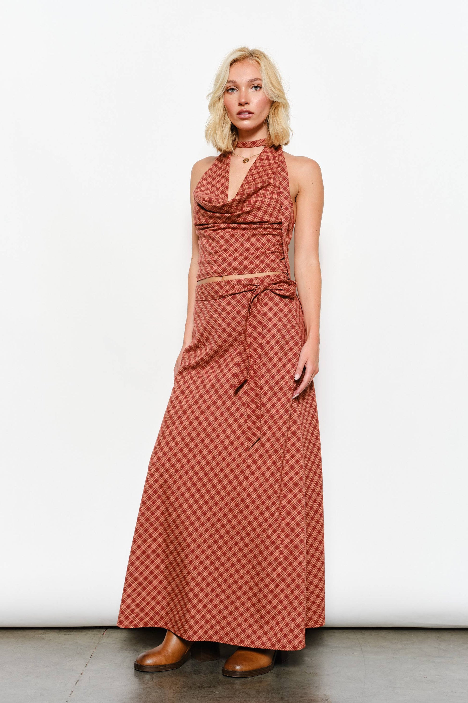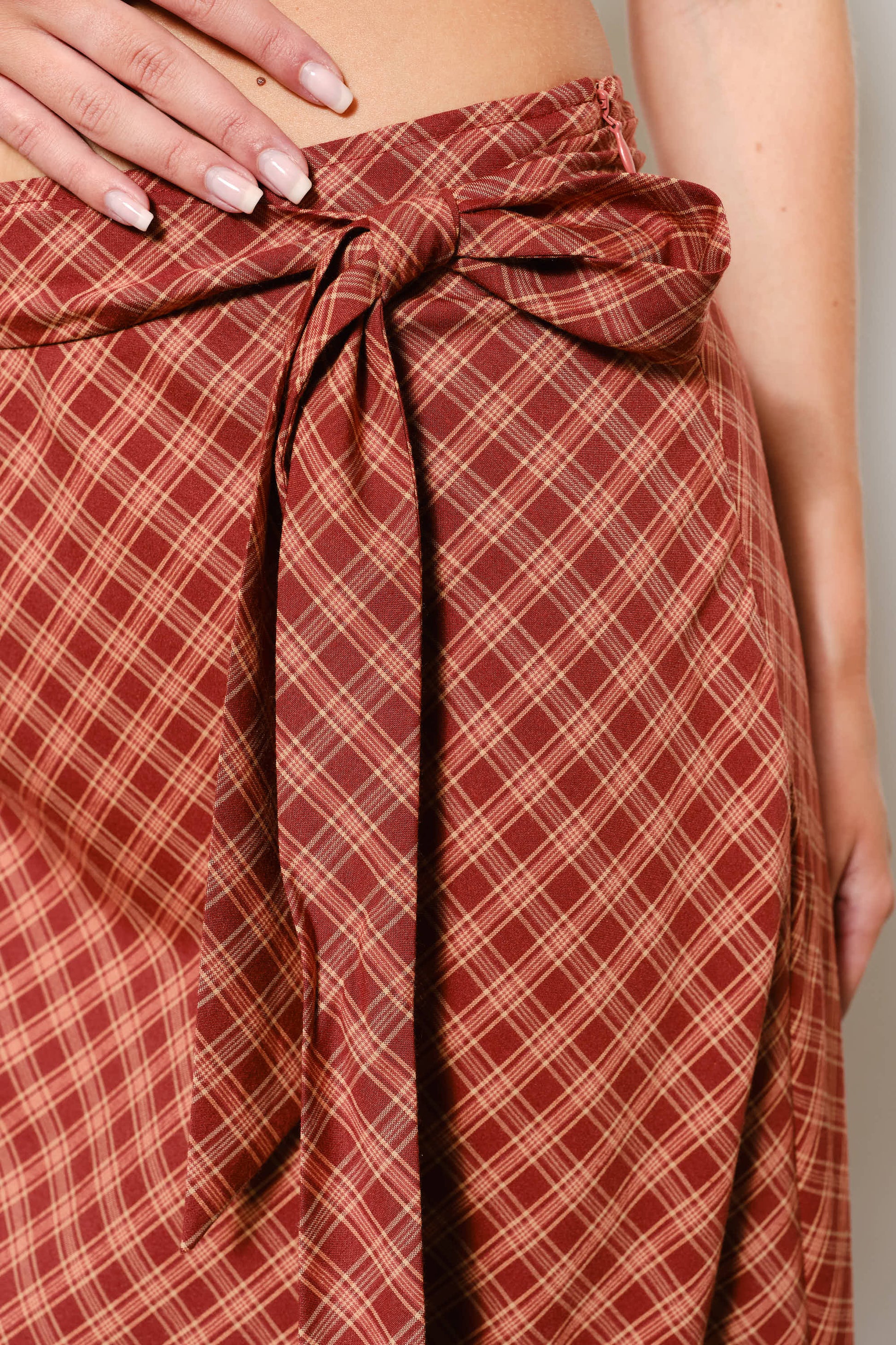 Plaid fabric for a sophisticated, versatile look - Self-tie waist for a customizable fit - Hidden zipper at side for a seamless finish - Fully lined for comfort and structure t