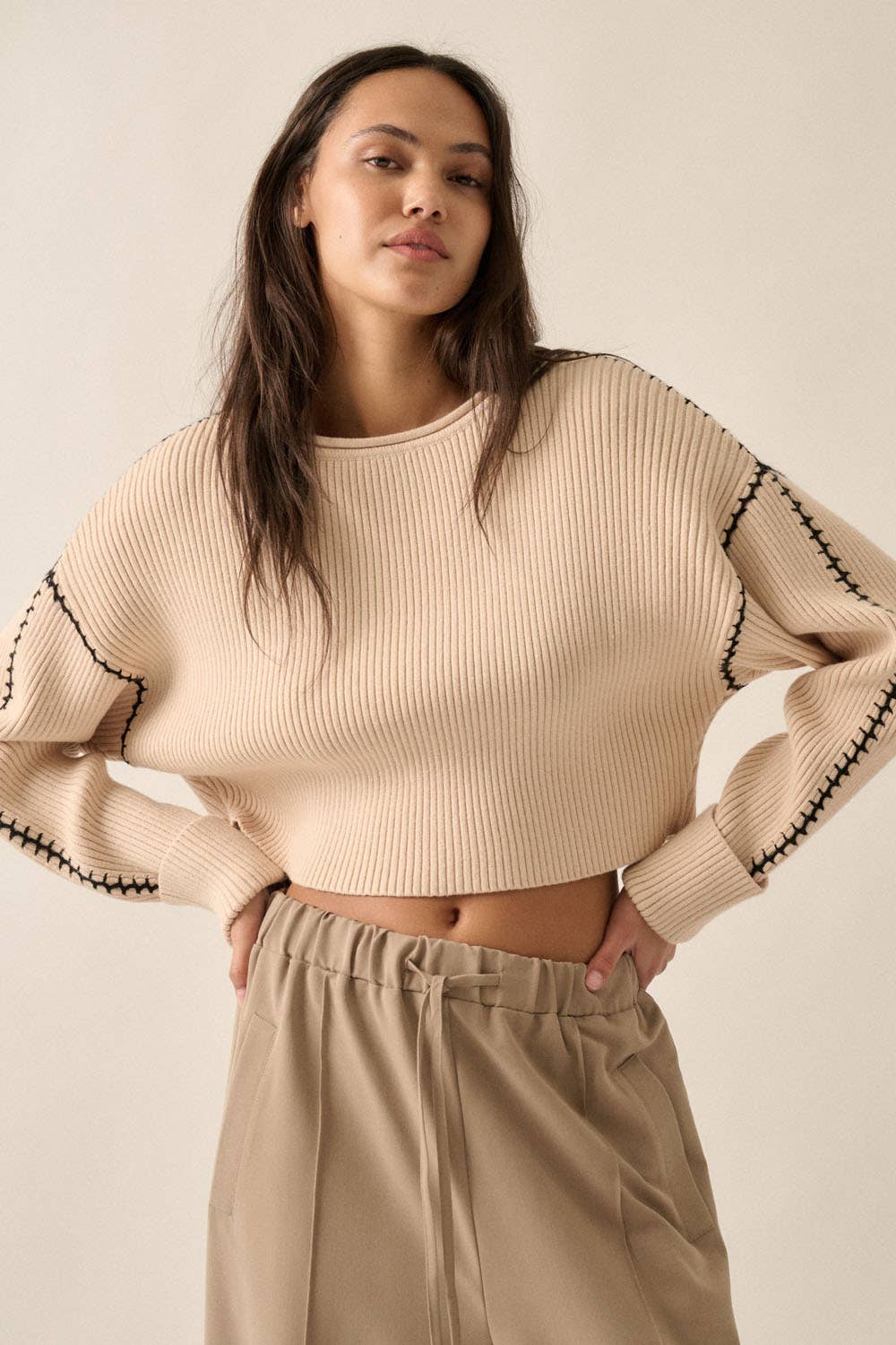 A solid, rib knit sweater with the following features: Round neckline. Stitch seam detail. Long sleeves with folded cuffs. Dropped shoulders. Cropped length. Relaxed fit.