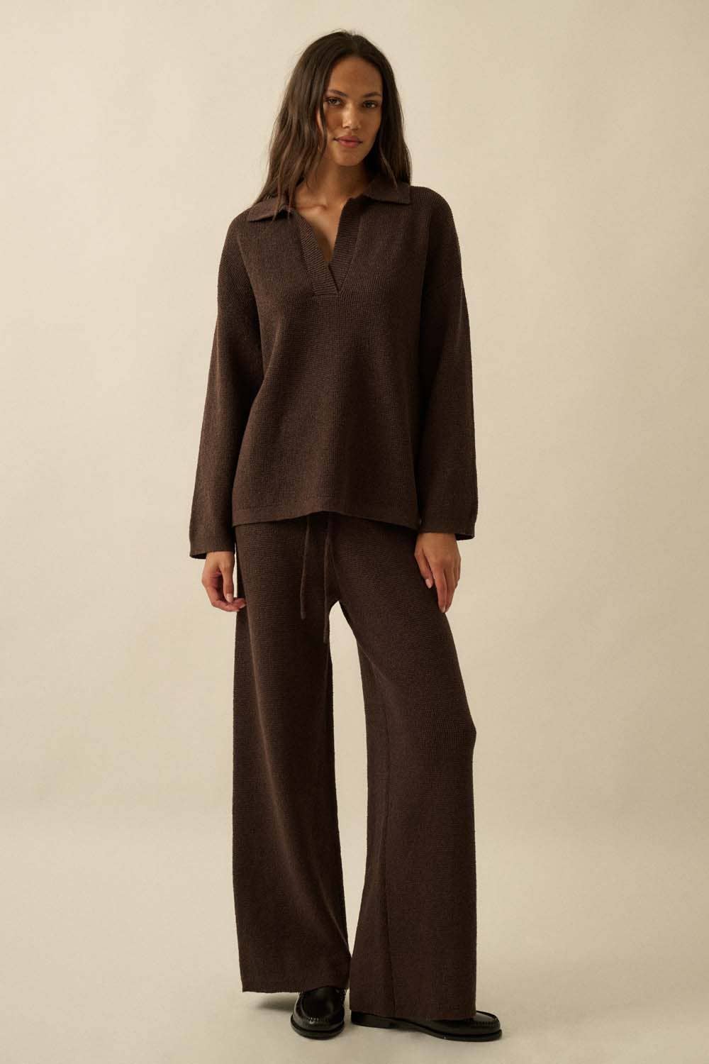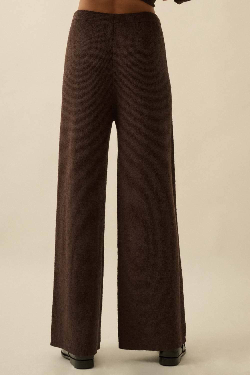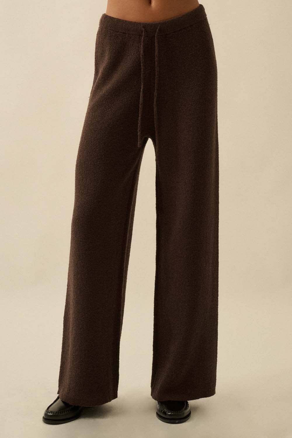 A pair of textured knit sweater pants with the following features: Drawstring elastic waist. Straight leg. Ribbed knit waistband and hem. Loose fit. Model Info: Height: 5 ft 9 in | Bust: 32 in | Waist: 24 in | Hips: 36 in | Wearing Size S.
