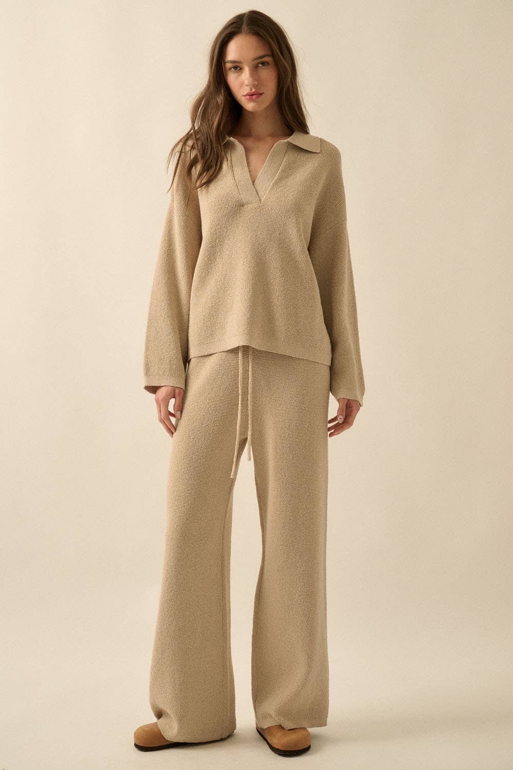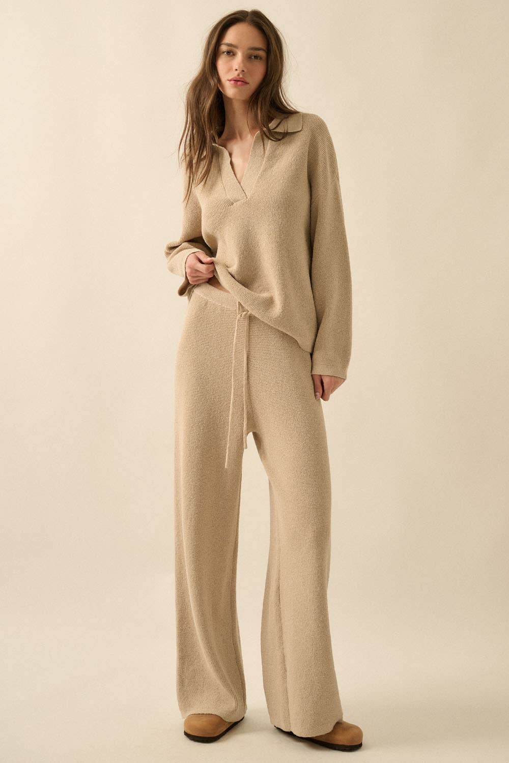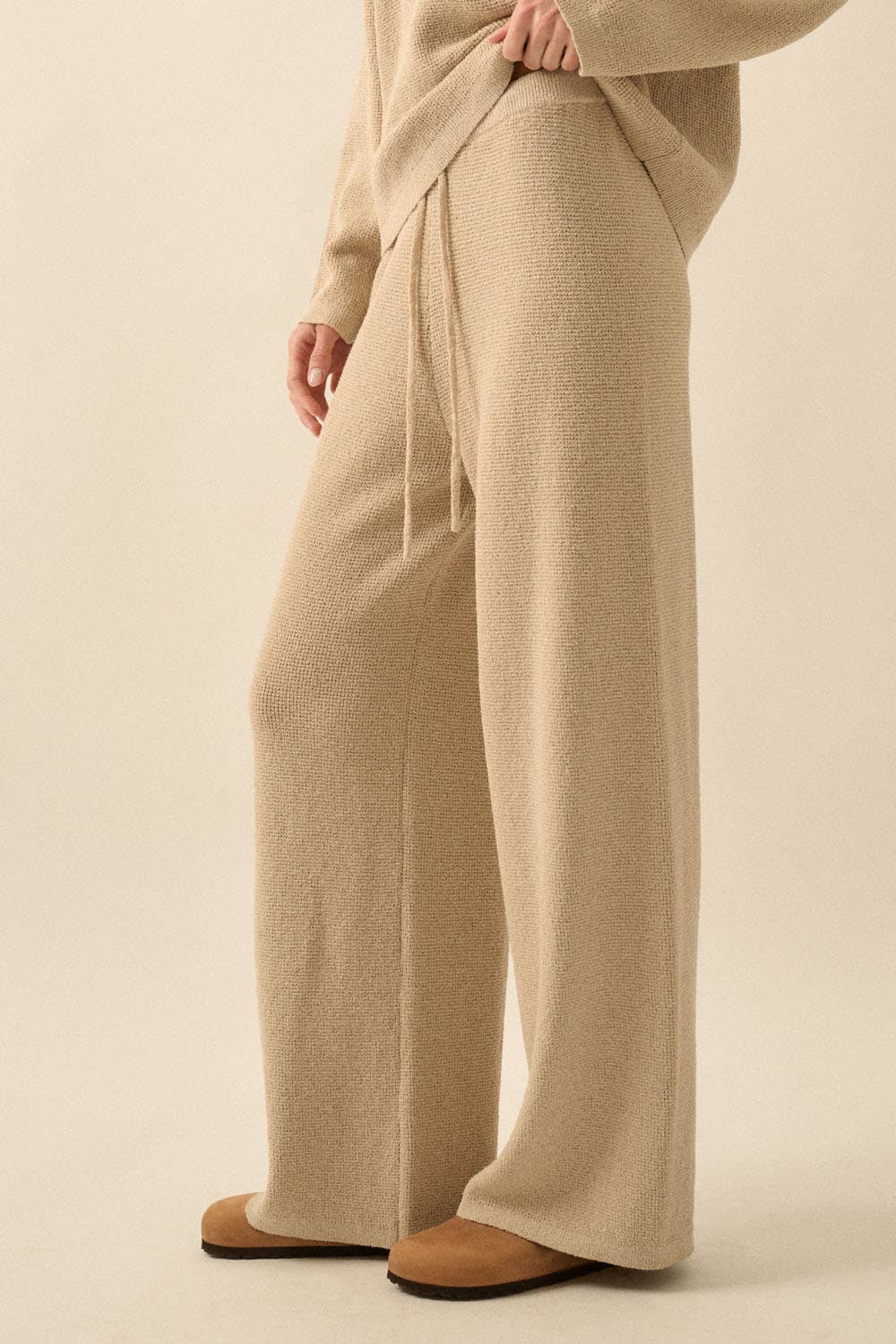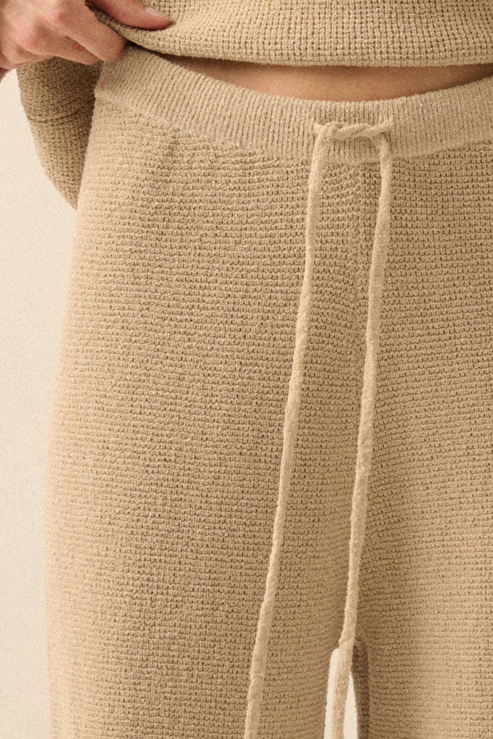 A pair of textured knit sweater pants with the following features: Drawstring elastic waist. Straight leg. Ribbed knit waistband and hem. Loose fit.