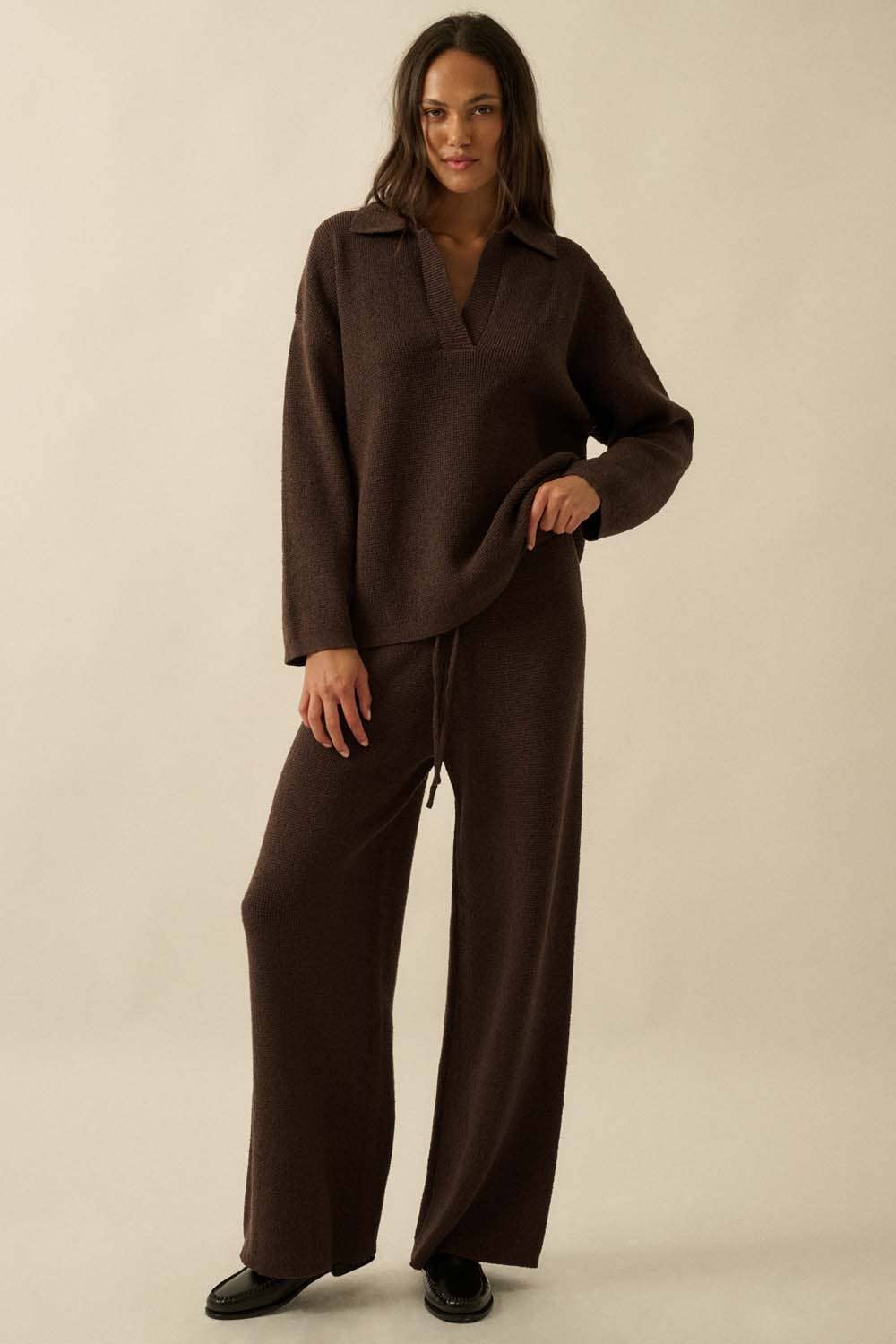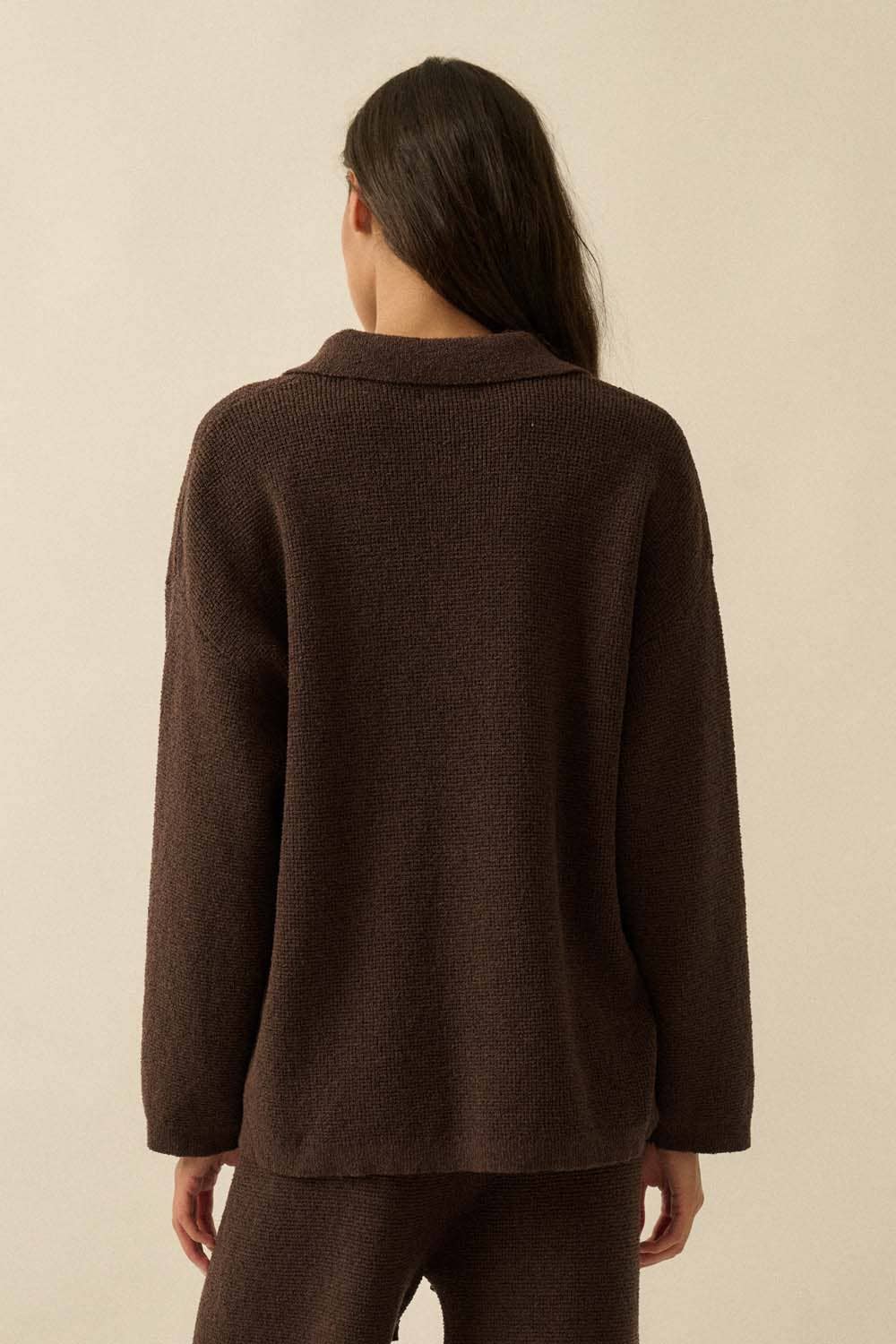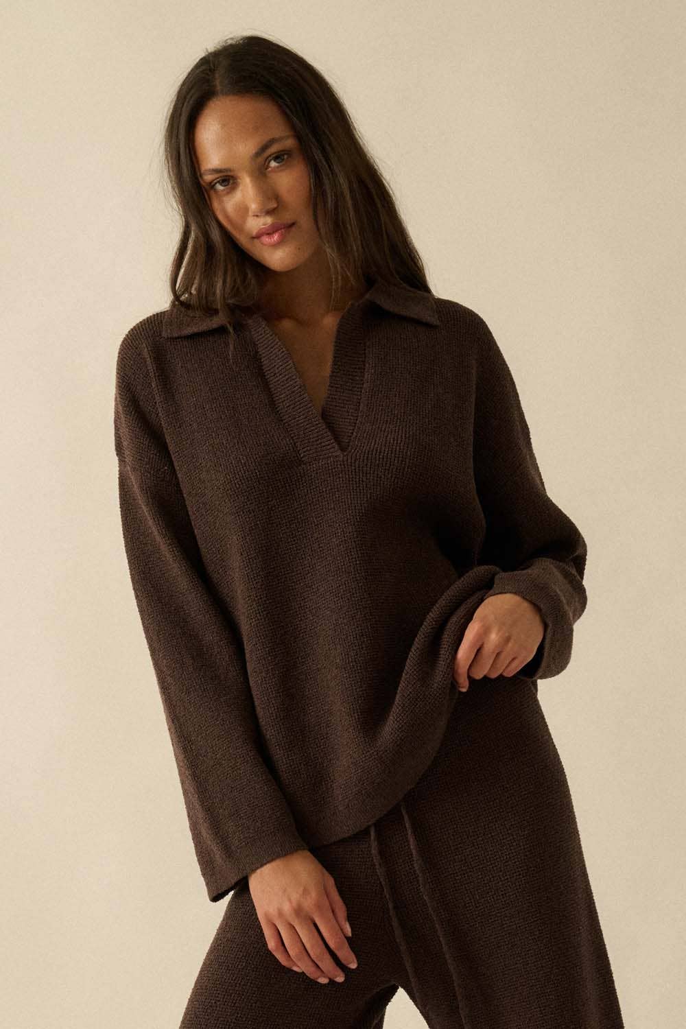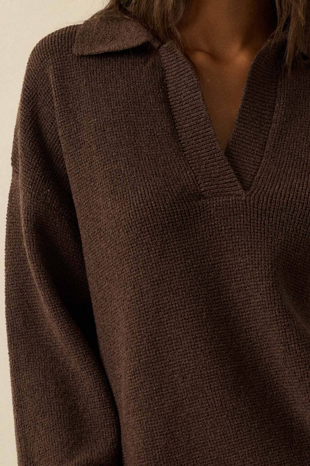 A textured knit sweater with the following features: Split V neckline with collar. Long sleeves. Drop shoulder. Ribbed knit collar, cuffs, and hem. Loose fit. Model Info: Height: 5 ft 9 in | Bust: 32 in | Waist: 24 in | Hips: 36 in | Wearing Size S.