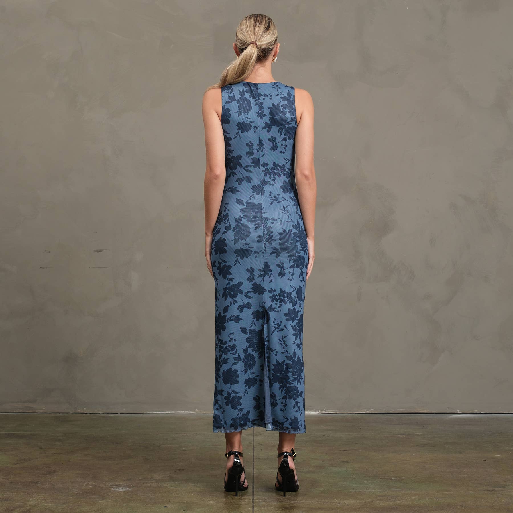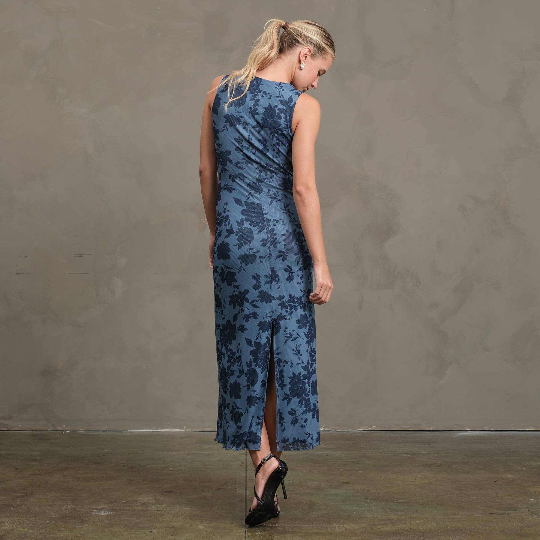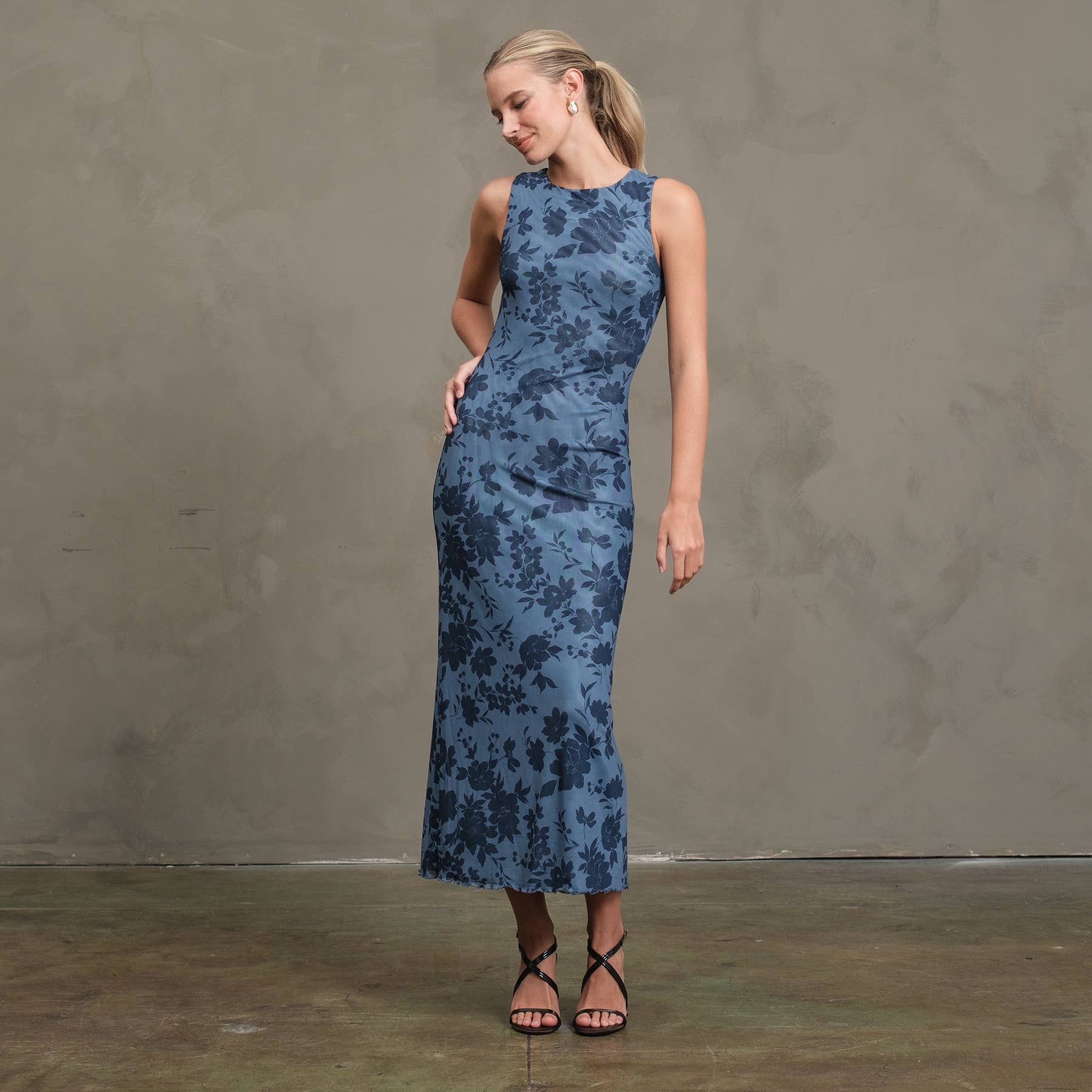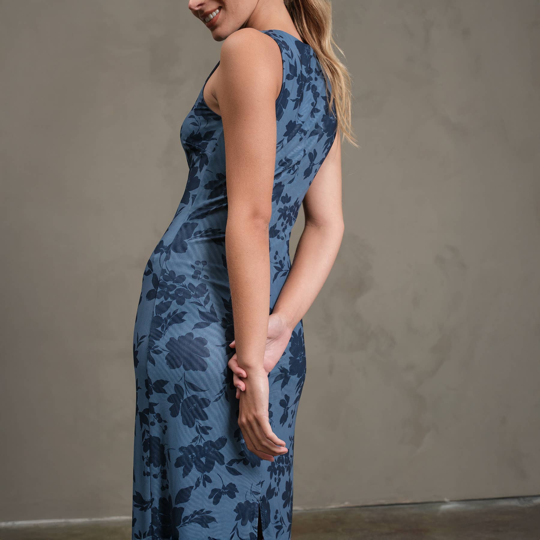 sleeveless midi dress - features a rich navy floral pattern over a smoky mesh base. Designed with a center back slit for ease of movement-Triple-layer mesh for full coverage -Pull-on style with stretch