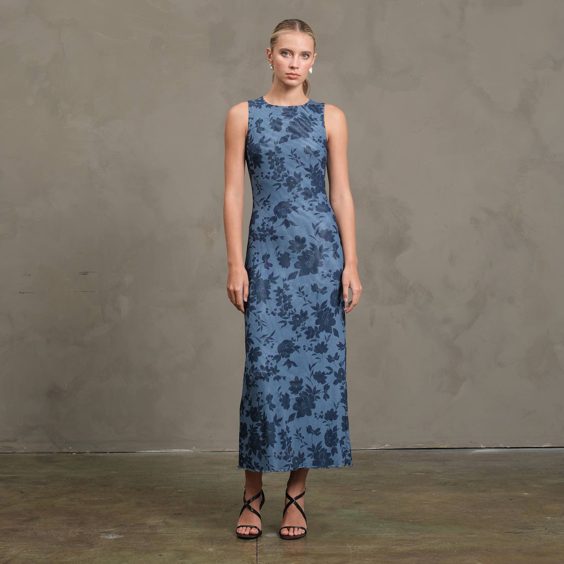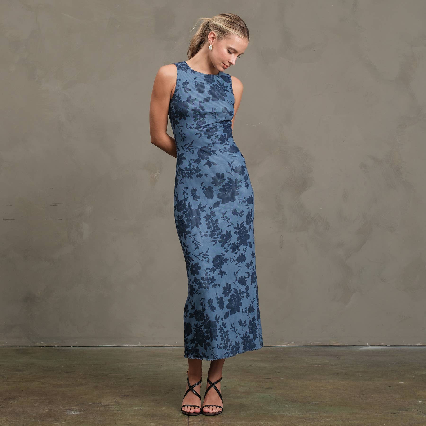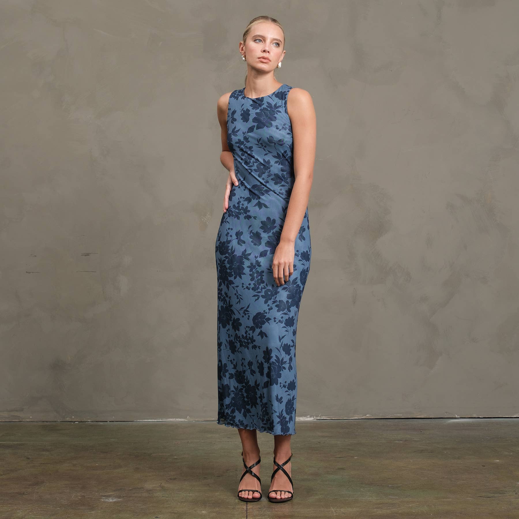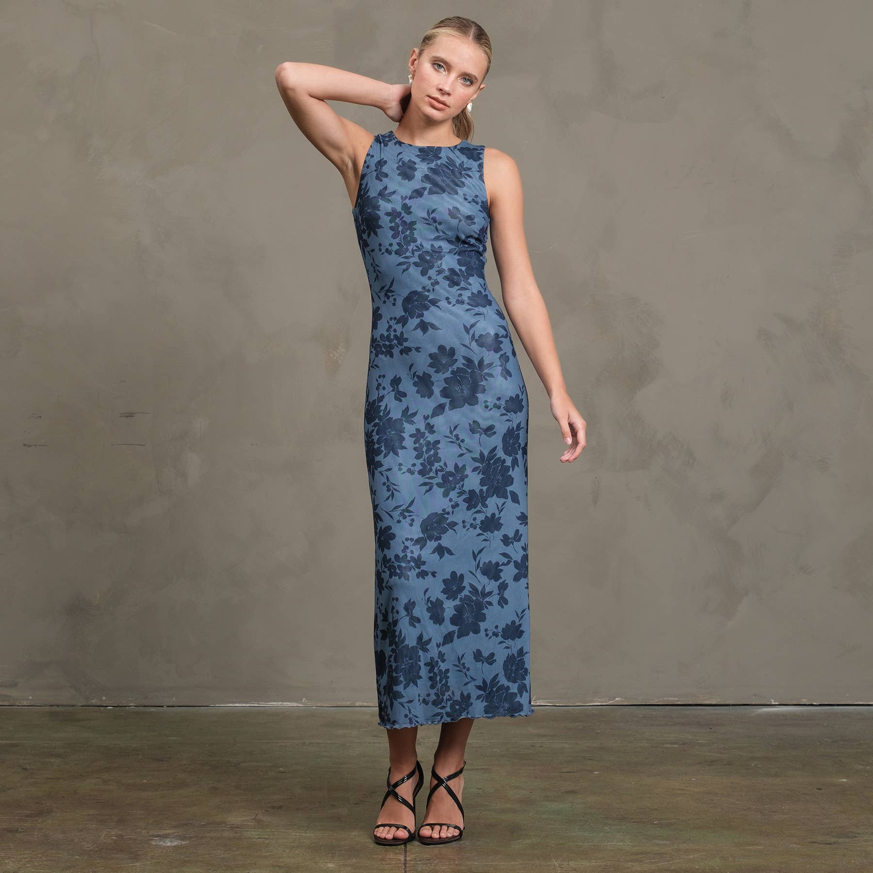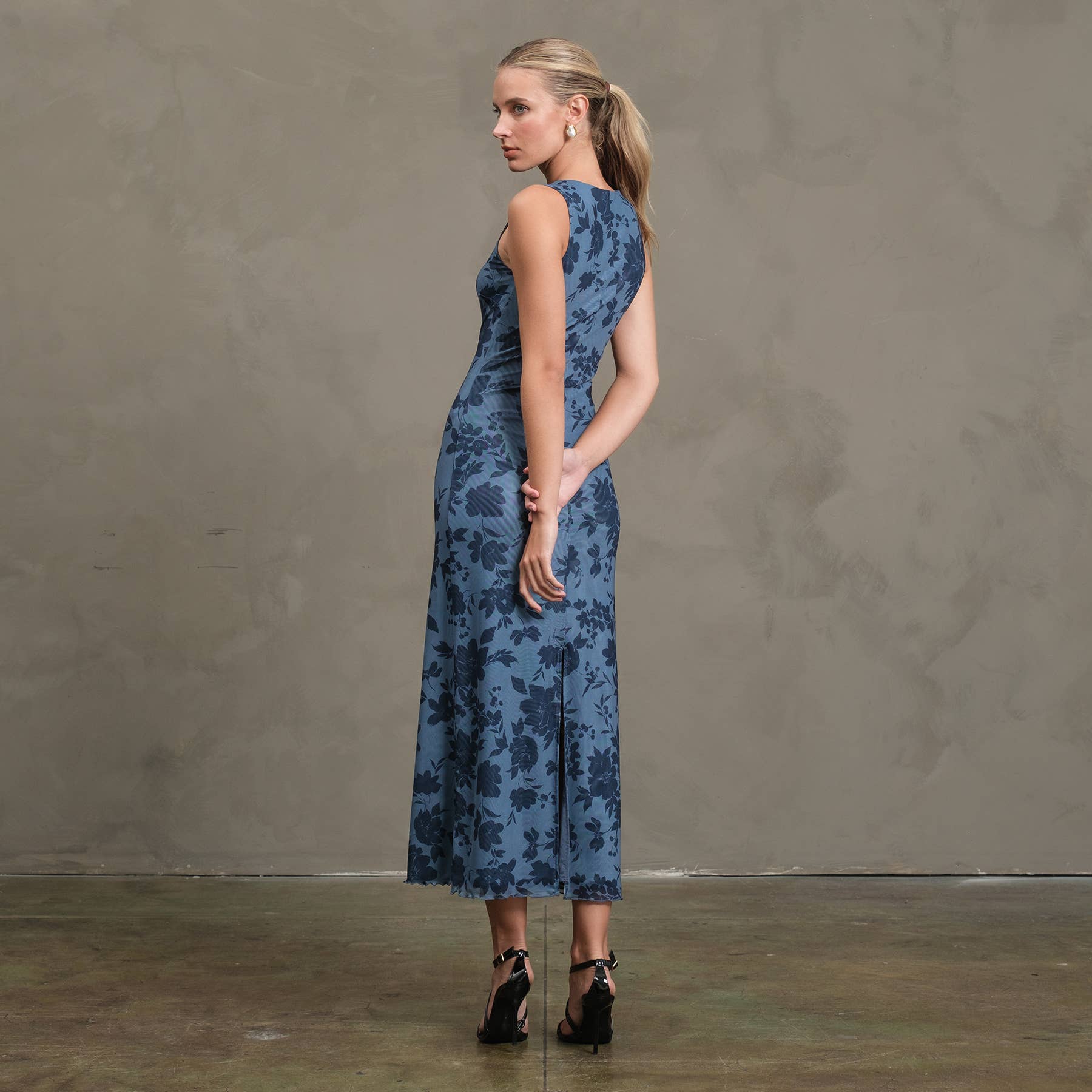 sleeveless midi dress - features a rich navy floral pattern over a smoky mesh base. Designed with a center back slit for ease of movement-Triple-layer mesh for full coverage -Pull-on style with stretch