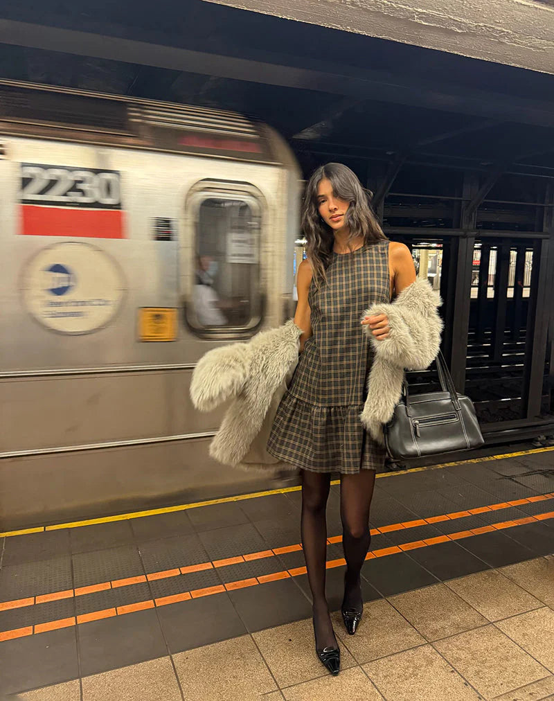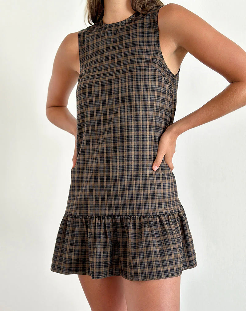 Our Samana Babydoll dress features a high neckline in a brown check pattern, this mini dress offers a dropped waist complete with a pleated hemline