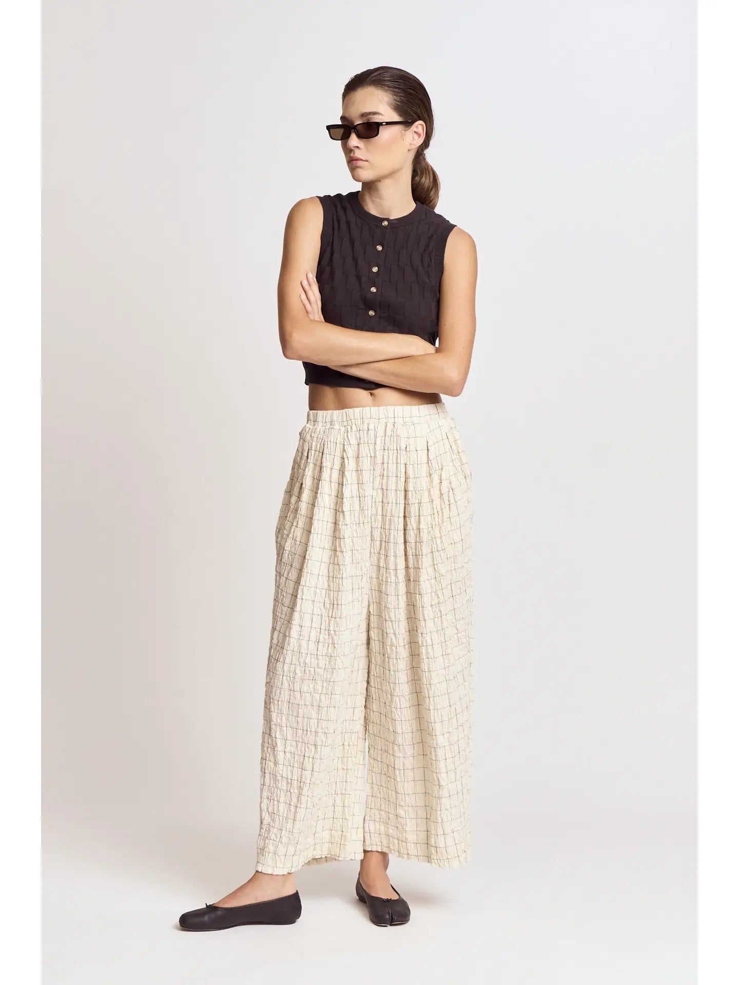 Check printed gauze pants with pocket detail