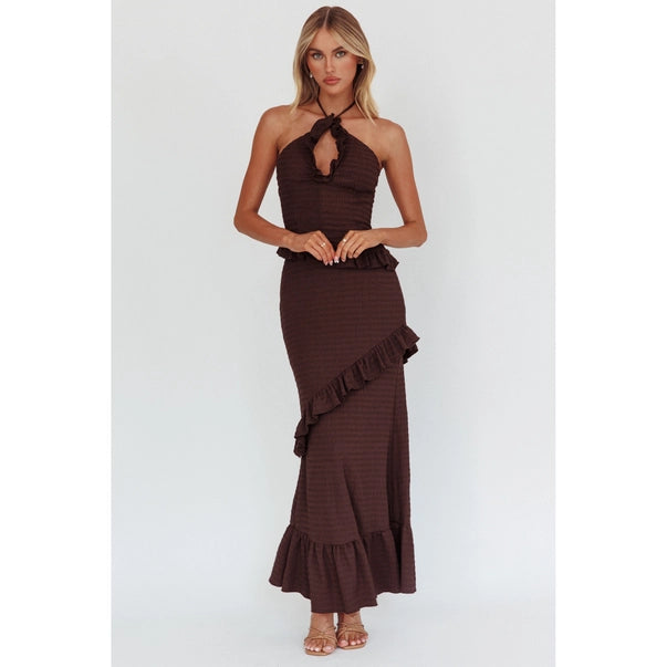 crinkle maxi dress - front cut out - halterneck - ruffle detail