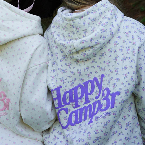 - Winter Wonderland print with Happy Camp3r logo in purple puff